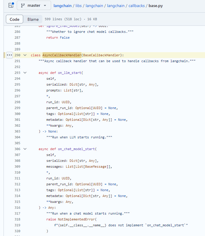 BaseCallbackHandler是最基本的回调处理器,你可以继承它来创建自己的回调处理器。它包含了多种方法,如on_llm_start/on_chat(当 LLM 开始运行时调用)和on_llm_error(当 LLM 出现错误时调用)等。