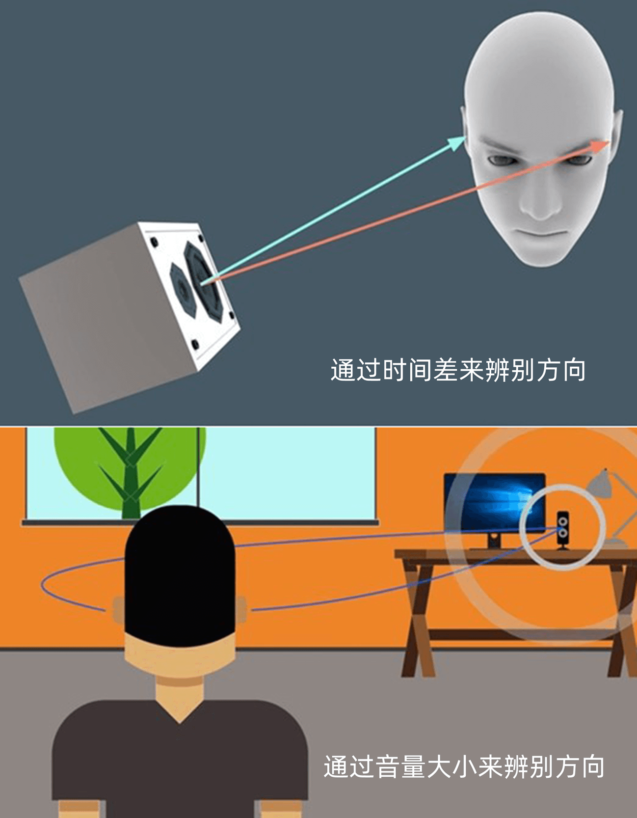 人的耳朵不仅仅可以听到声音,还可以辨别方向。这主要是因为我们的耳朵可以听出时间差和声级差。时间差是指声音抵达两只耳朵时间的前后差别,声级差则是两只耳朵听到声音强度的大小差别。