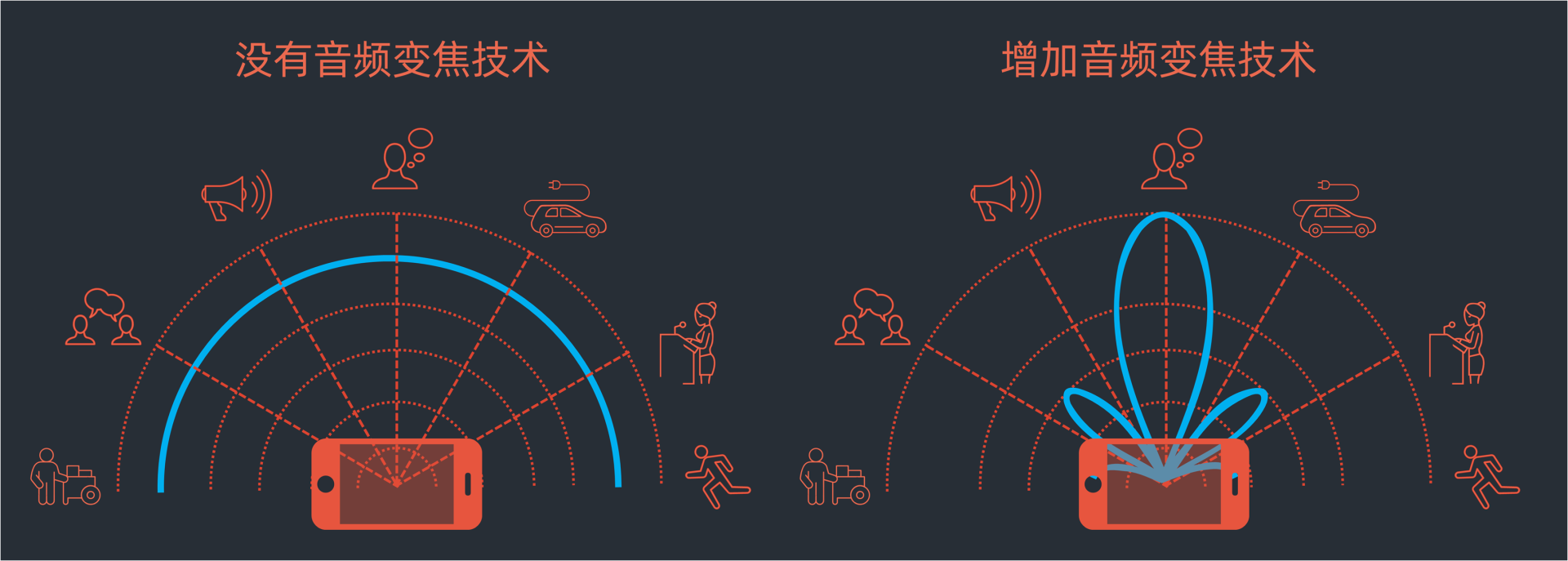 比如我们在很多华为手机里,就利用多枚立体收音麦克风和AI算法,实现了指向性麦克风收音。再配合上摄像头的焦距,当拉近远处的景物的时候,远处的声音也会逐渐被放大,同时还会消除掉不必要的噪音。把焦距拉远,随着画面景物越来越小,对应景物的声音也会随之变小。