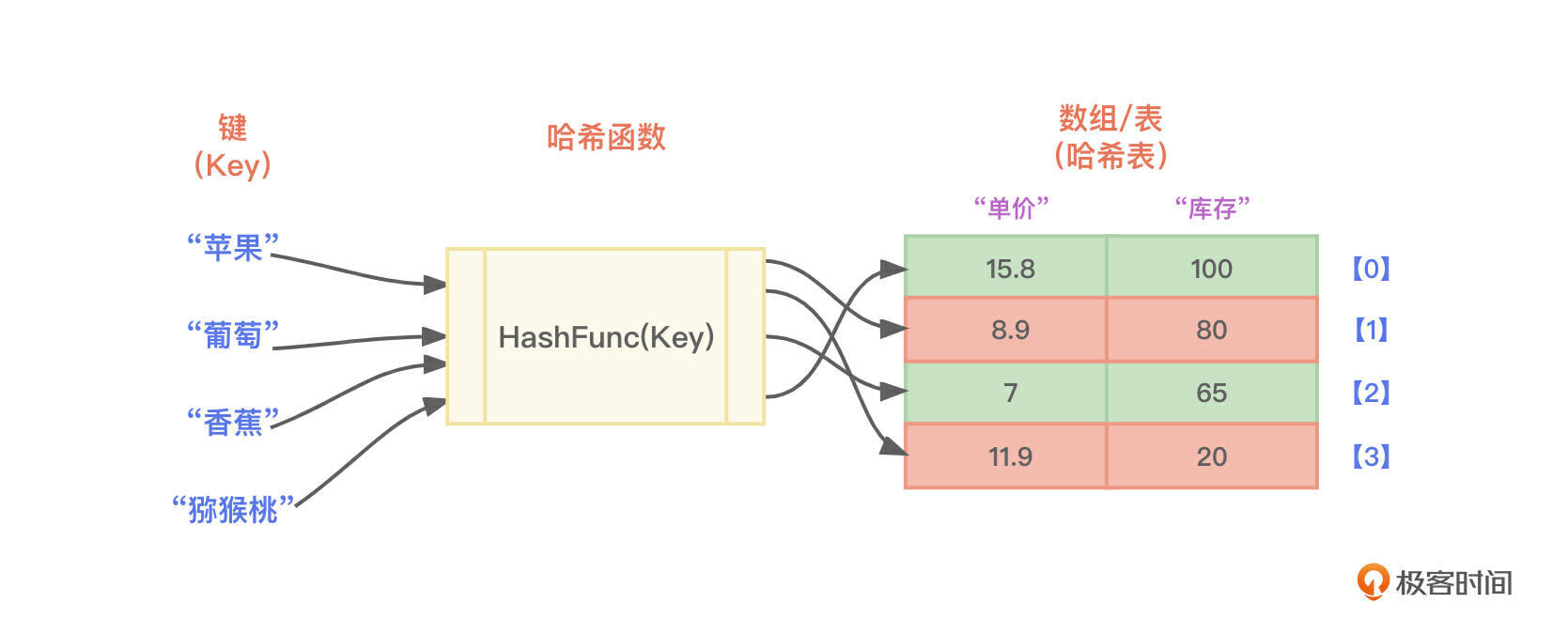 - **传递给哈希函数不同的参数(不同的商品名称),哈希函数肯定会返回不同的整数。**例如用“苹果”做参数传递给哈希函数,哈希函数返回的整数是11,而用“鸭梨”做参数传递给哈希函数,哈希函数返回的是整数是23,绝不可能也返回整数11。