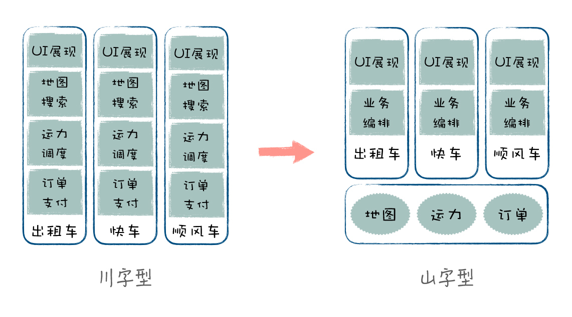 - 另一方面,也和各个业务线的相似度有关,相似度越高,意味着业务线之间有更多类似的逻辑,更适合“山”字形。比如,出行平台的各个出行方式相似度很高,适合“山”字形;但同一个公司的出行业务和互联网金融业务,差异比较大,就可以考虑“川”字形,而没必要把它们强行扭在一起。