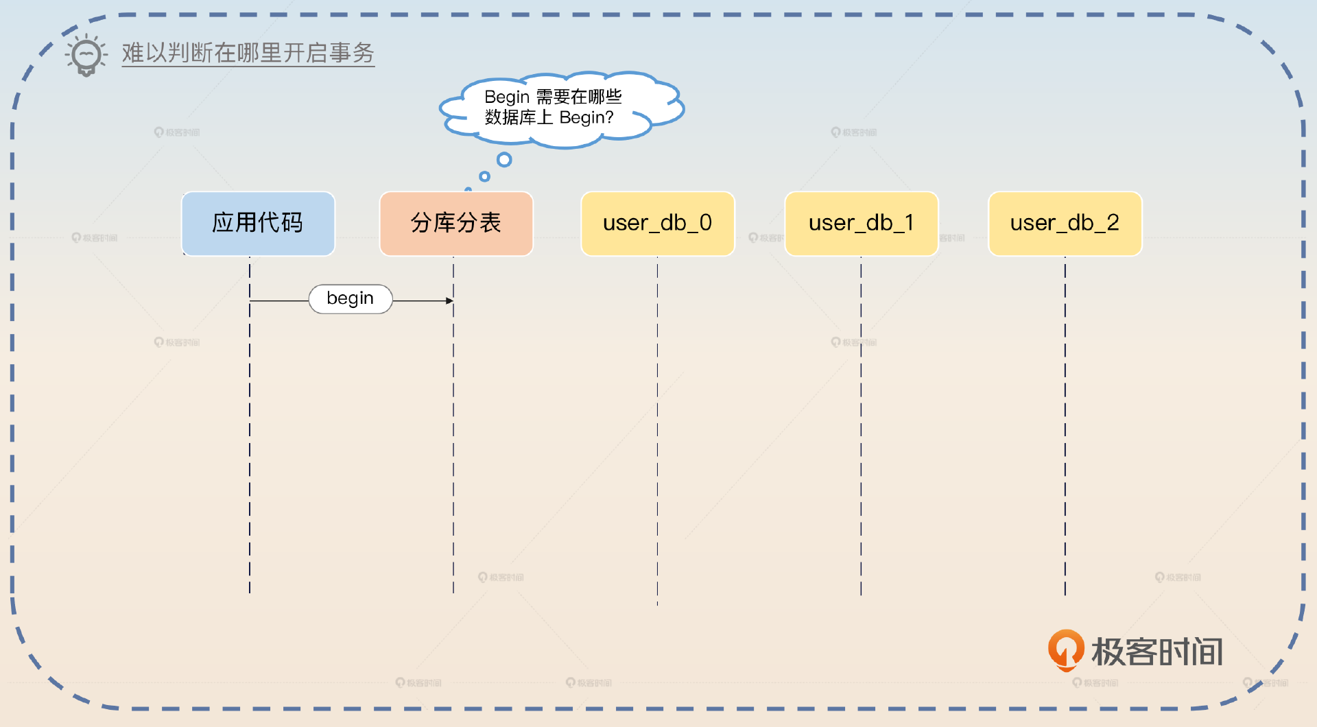 比如说,在同一个场景下,某个请求过来,你处理的时候在分库分表中间件上调用了 Begin 方法,这个请求最终在 user_db_0 和 user_db_1 上开启了事务;但是另外一个请求过来,因为参数不同,它可能最终在 user_db_2 上开启了事务。