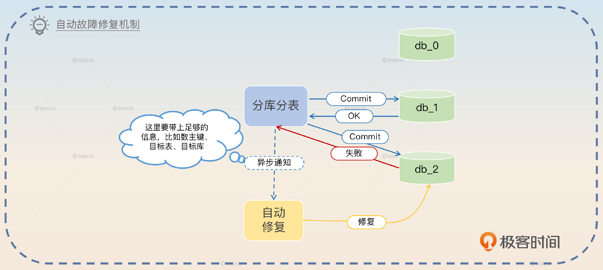 在重试失败的时候,最开始我们公司就是告警,然后人手工介入处理。后来我改进了这个机制,引入了自动故障处理机制。也就是说如果一个事务里面部分数据库提交或者回滚失败,触发告警,然后自动故障处理机制就会根据告警的上下文来修复数据。