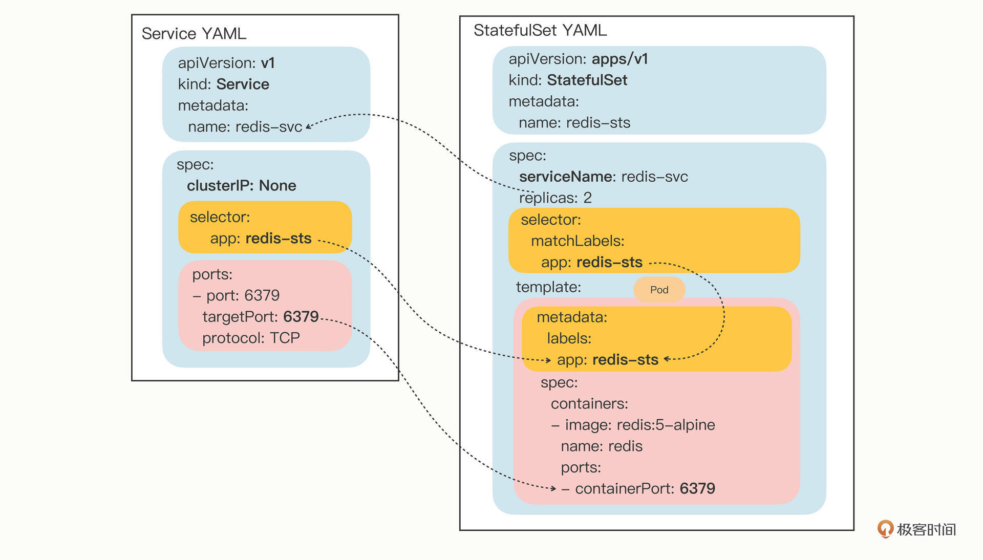 我画了一张图展示StatefulSet与Service对象的关系,你可以参考一下它们字段之间的互相引用: