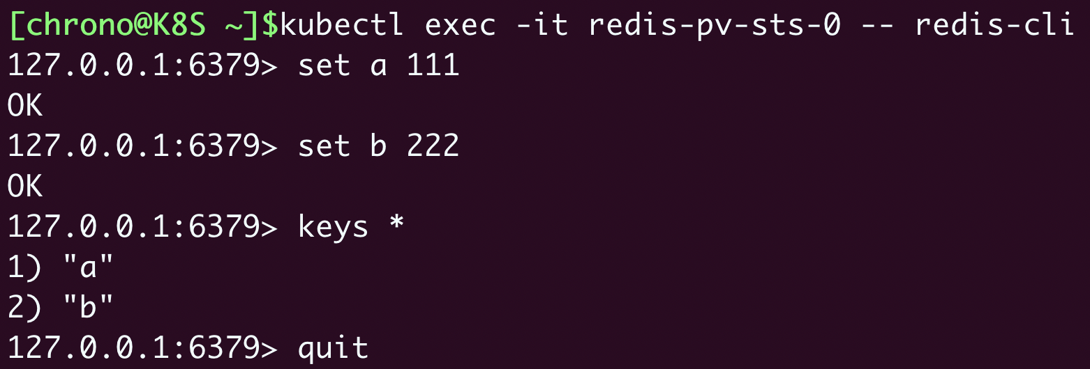 1 | kubectl exec -it redis-pv-sts-0 -- redis-cli |