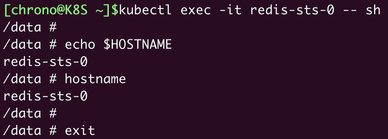 在Pod里查看环境变量 $HOSTNAME 或者是执行命令 hostname,都可以得到这个Pod的名字 redis-sts-0。