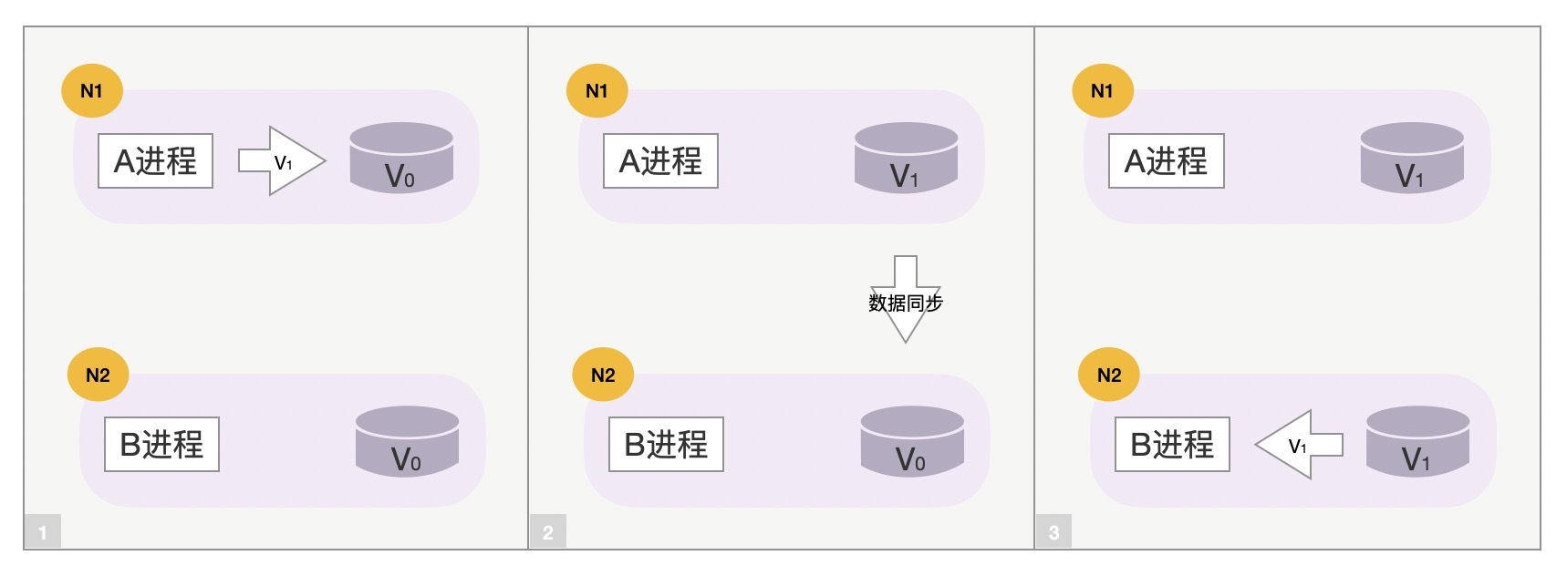 我们通过以下3张示意图,快速理解下这3个词的意义。下图中N1、N2两台主机上运行着A进程和B进程,它们操作着同一个用户的数据(数据的初始值是V0),这里N1和N2主机就处于不同的Partition分区中,如下所示: