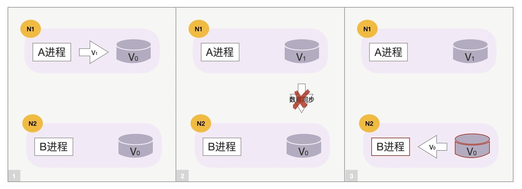 正常情况下,当用户请求到达N1主机上的A进程,并将数据V0修改为V1后,A进程将会把这一修改行为同步到N2主机上的B进程,最终N1、N2上的数据都是V1,这就保持了系统的Consistency一致性。