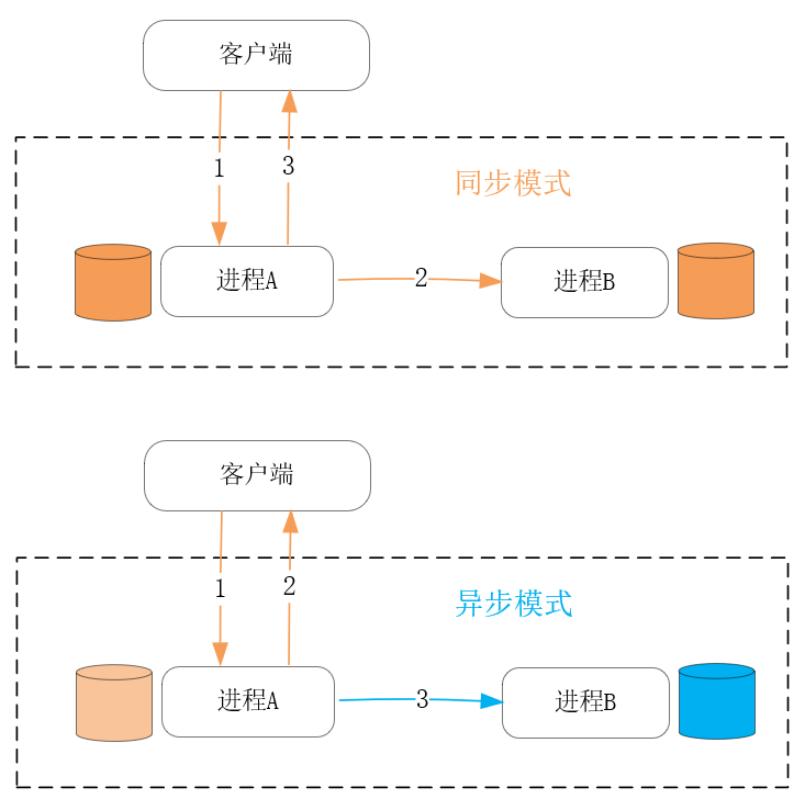 虽然缓存也可以在一定程度上增加系统的并发处理连接,但这更多是缘于缓存采用了更快的算法以及存储介质带来的收益。从水平方向上,在更多的主机上添加数据副本,并在其上用新的进程提供服务,这才是提升系统并发处理能力最有效的手段。此时,进程间同步数据主要包含两种方式:同步方式以及异步方式,前者会在每个更新请求完成前,将数据成功同步到每个副本后,请求才会处理完成,而后者则会在处理完请求后,才开始异步地同步数据到副本中,如下图所示: