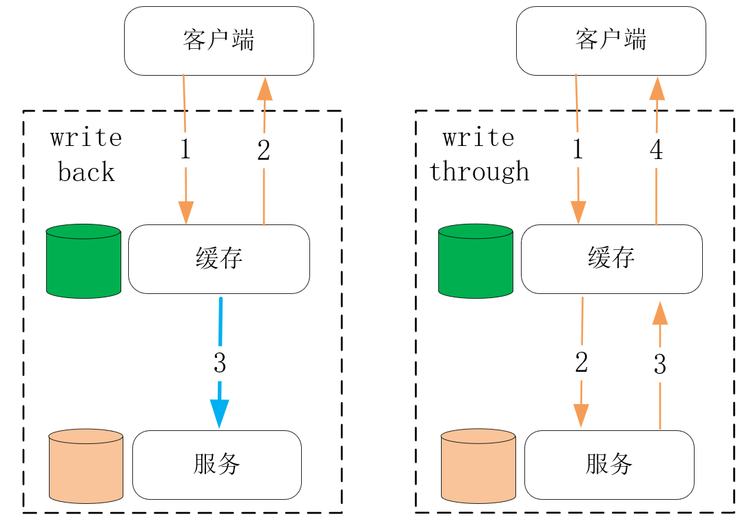 事实上,也有很多以写操作触发缓存更新的设计,它们通常又分为write back和write through两种模式。其中,write back牺牲了更多的一致性,但带来了更低的请求时延。比如[[第4课]] 介绍过的Linux磁盘高速缓存就采用了write back这种设计,它虽然是单机内的一种缓存设计,但在分布式系统中缓存的设计方式也是一样的。而write through会在更新数据成功后再更新缓存,虽然带来了很好的一致性,但写操作的时延会更久,如下图所示: