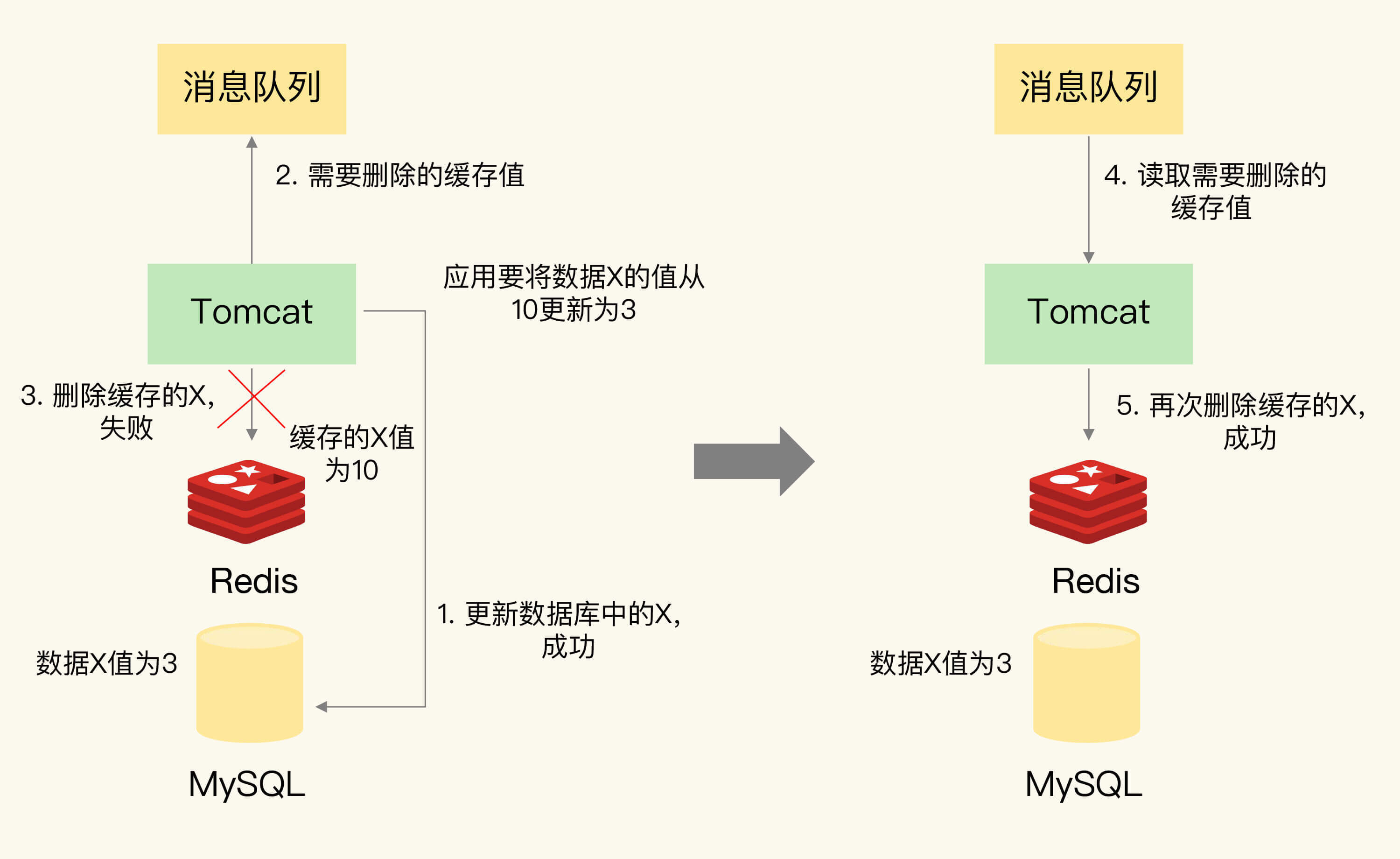 具体来说,可以把要删除的缓存值或者是要更新的数据库值暂存到消息队列中(例如使用Kafka消息队列)。当应用没有能够成功地删除缓存值或者是更新数据库值时,可以从消息队列中重新读取这些值,然后再次进行删除或更新。