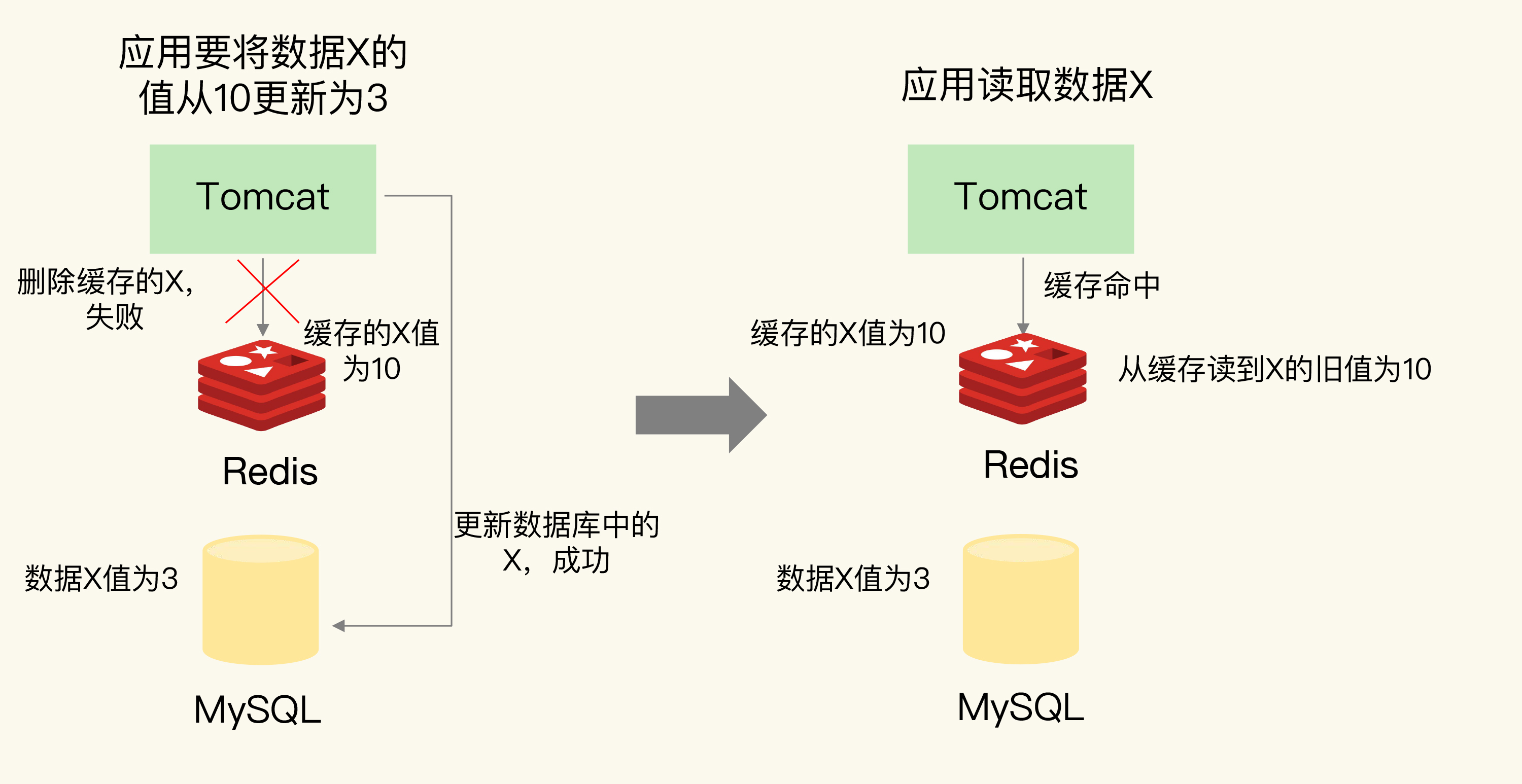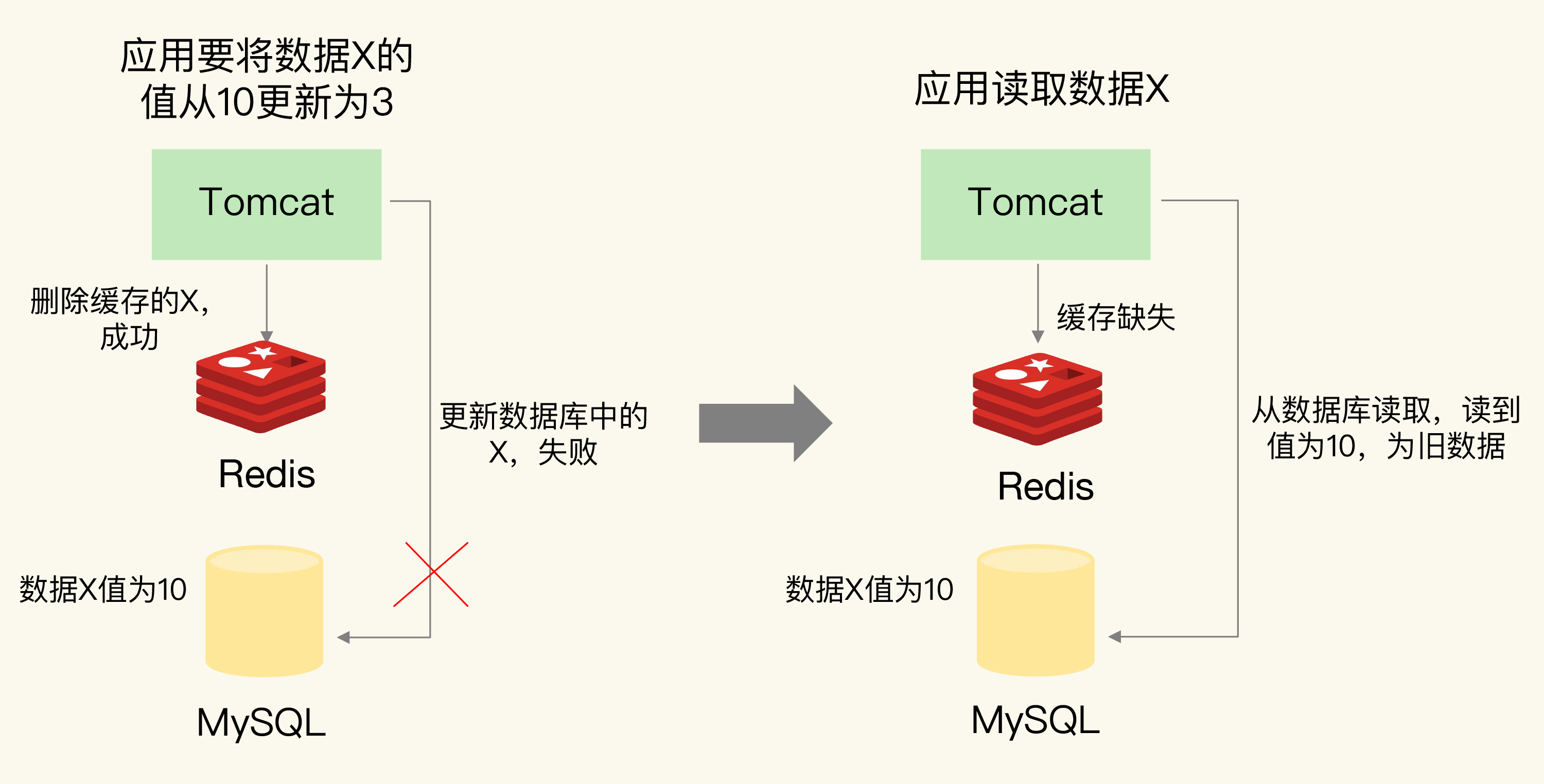 应用要把数据X的值从10更新为3,先成功更新了数据库,然后在Redis缓存中删除X的缓存,但是这个操作却失败了,这个时候,数据库中X的新值为3,Redis中的X的缓存值为10,这肯定是不一致的。如果刚好此时有其他客户端也发送请求访问X,会先在Redis中查询,该客户端会发现缓存命中,但是读到的却是旧值10。