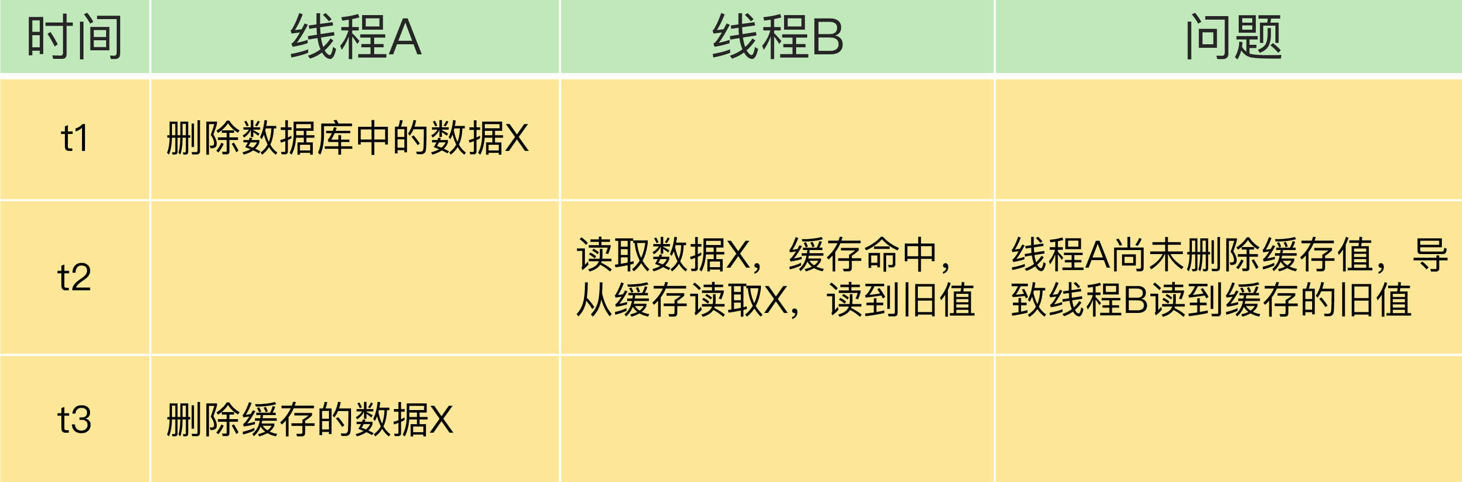 等到线程B从数据库读取完数据、更新了缓存后,线程A才开始更新数据库,此时,缓存中的数据是旧值,而数据库中的是最新值,两者就不一致了。