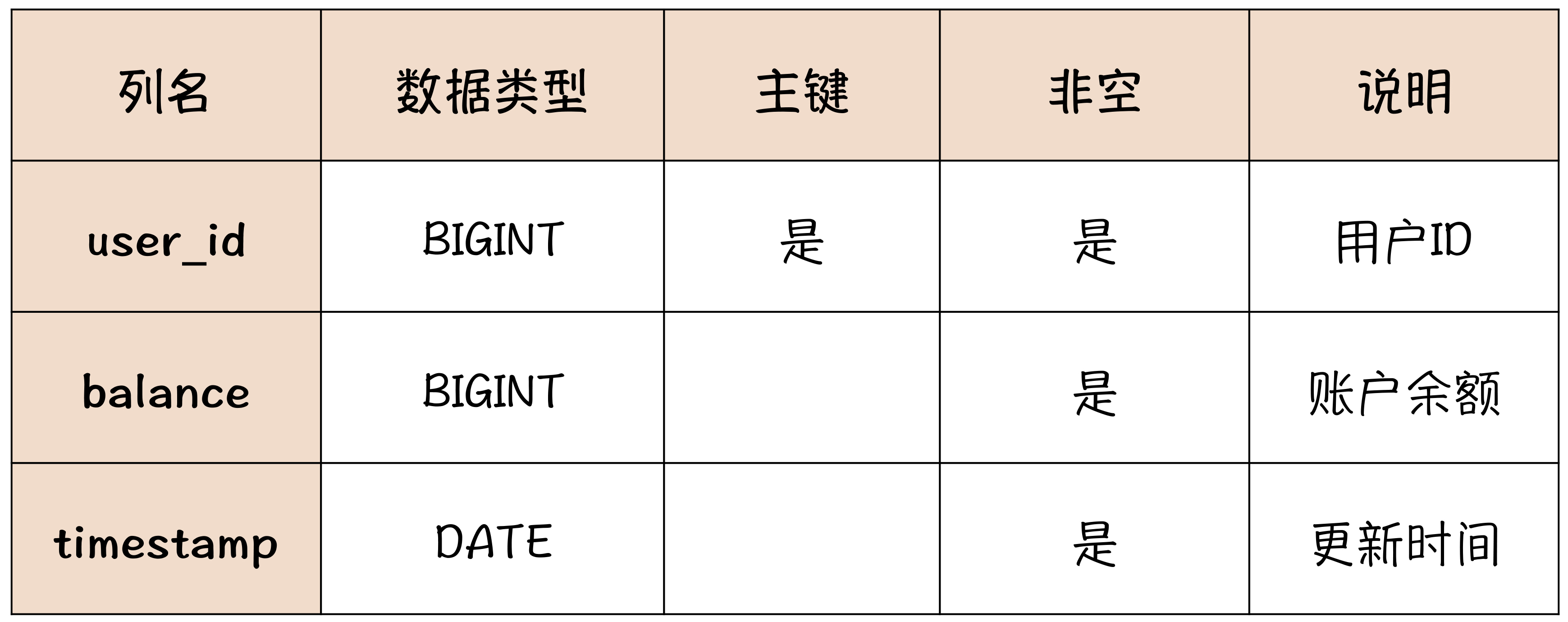 这个表包括用户ID、账户余额和更新时间三个字段。每次交易的时候,根据用户ID去更新这个账户的余额就可以了。