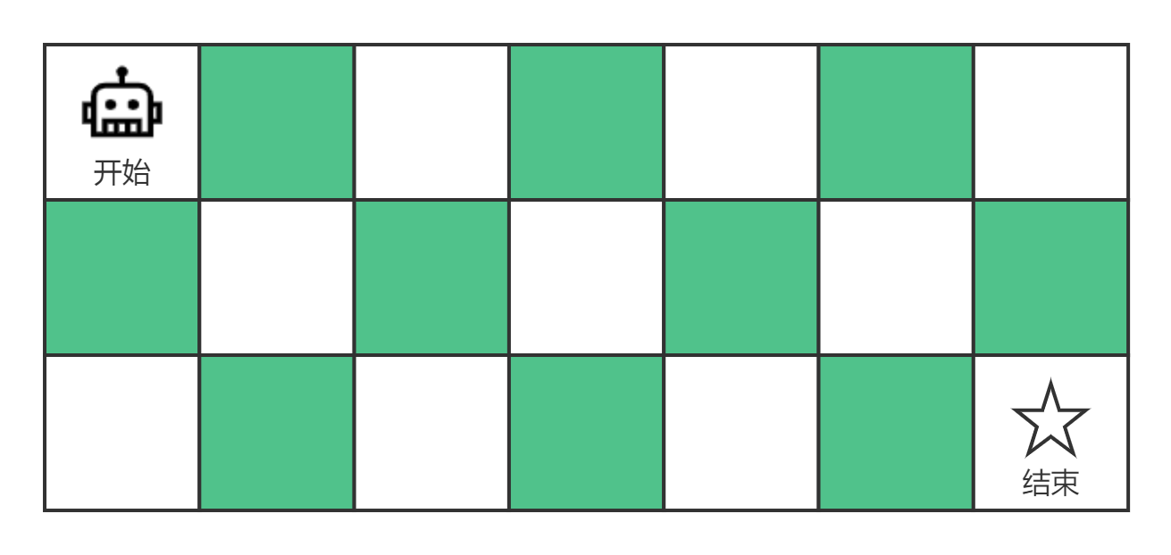 问题:一个机器人位于一个 m * n 网格的左上角 (起始点在下图中标记为“开始” ),机器人每次只能向下或者向右移动一步,现在机器人试图达到网格的右下角(在下图中标记为“结束”)。问总共有多少条不同的路径?