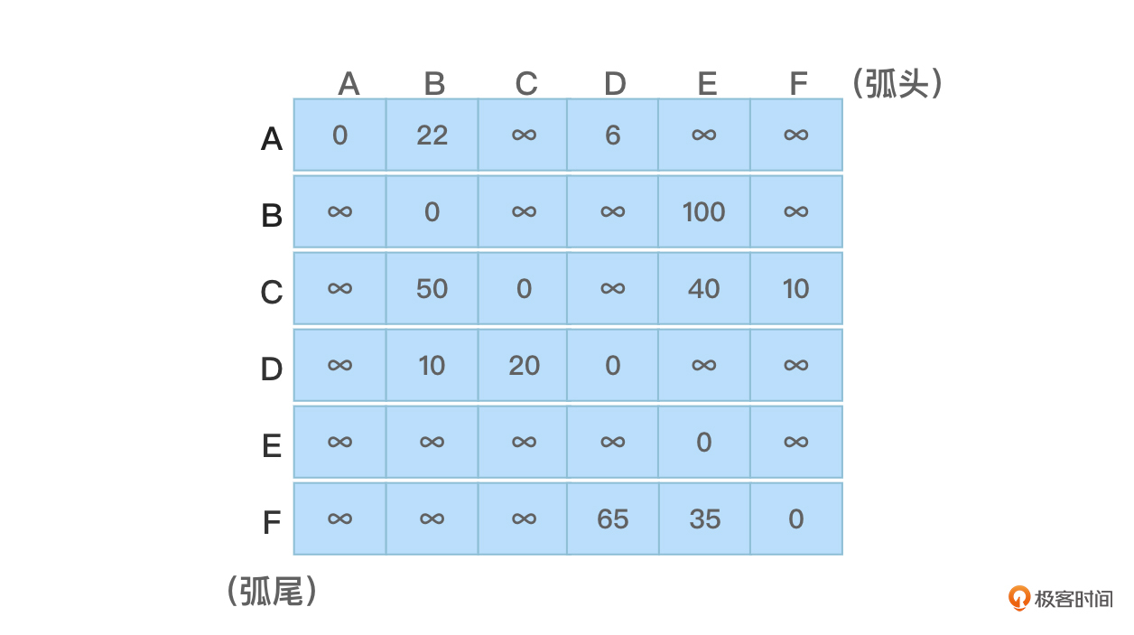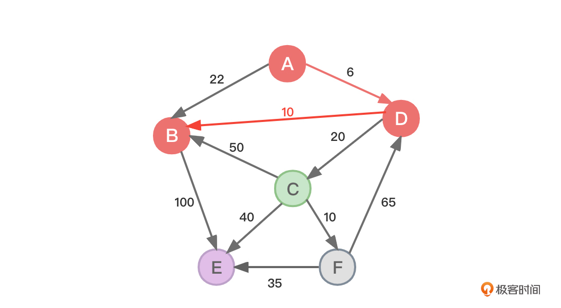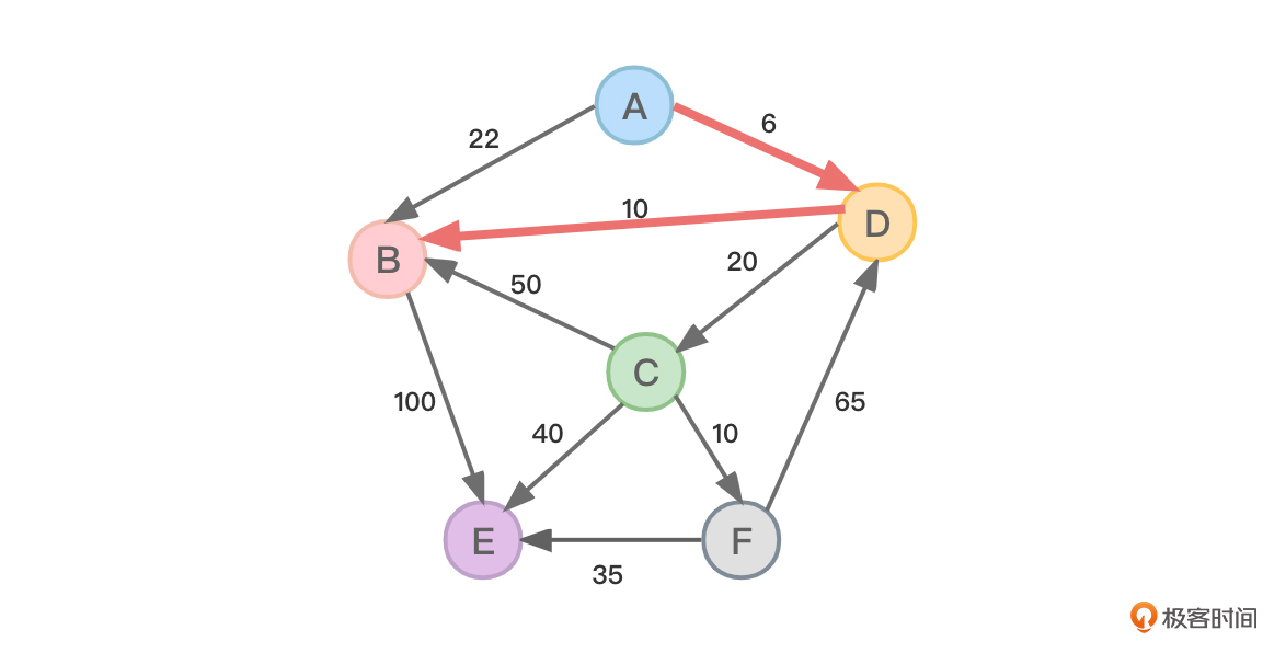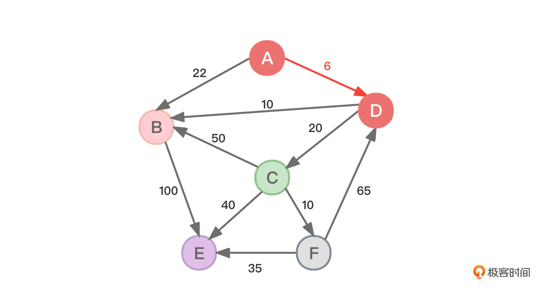 - 源顶点A到达顶点B是通过顶点D到达的(B的上一个顶点是D)。