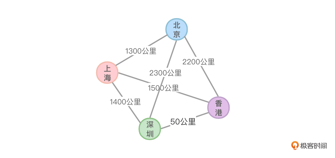- 如果把城市之间的距离作为权值,利用最短路径算法,可以找到从某个城市去到另外一个城市如何走距离最短。