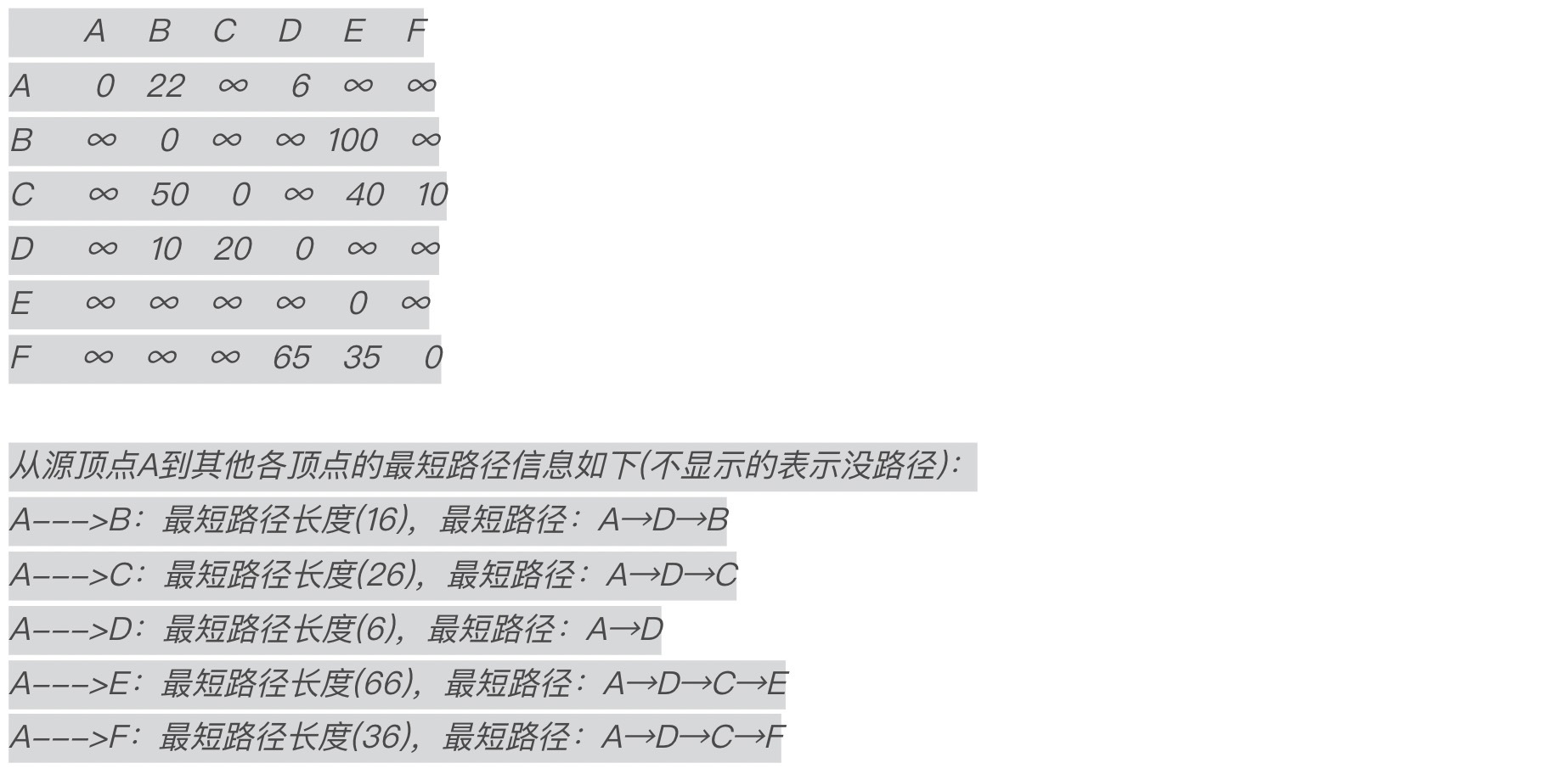A→C : 距离=∞ (∞表示A到C之间不直接相连)