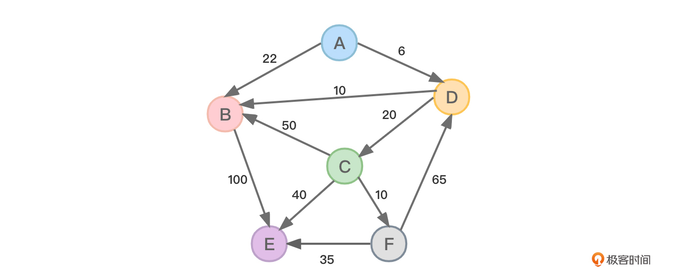 这节课我给出一个图来向你详细阐述最短路径的概念,然后提出了如何从某个顶点求得到其他各个顶点的最短路径的问题。从而引出了迪杰斯特拉(Dijkstra)算法——专门用来求从某个顶点到其他各个顶点最短路径的算法。