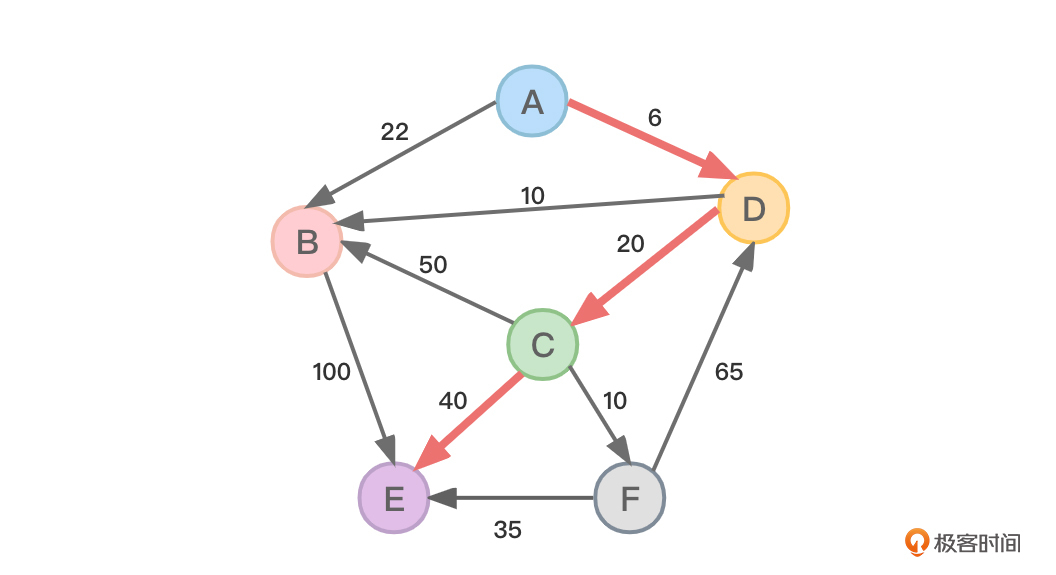 - 源顶点A到达顶点C也是通过顶点D到达的(C的上一个顶点是D)。
