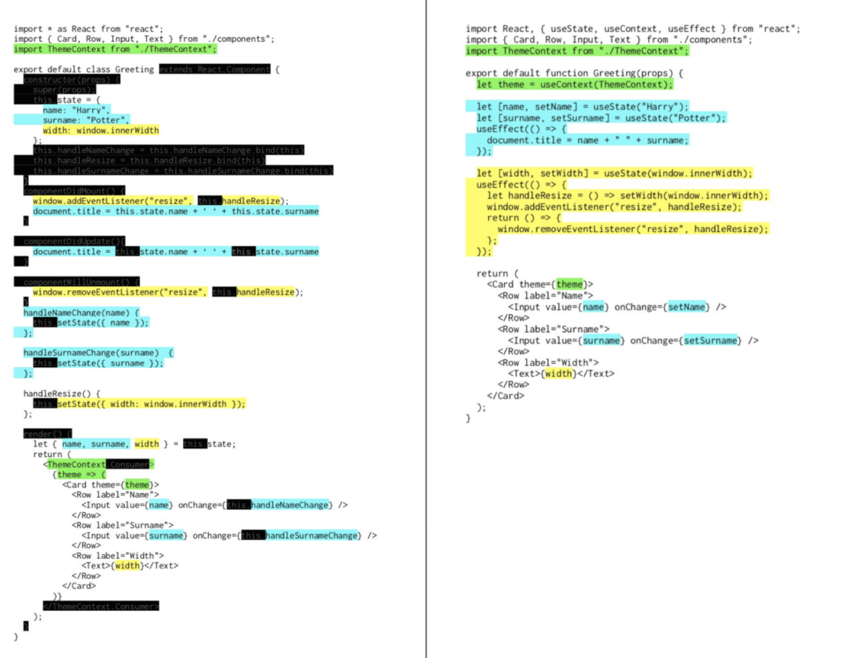 图的左侧是 Class 组件,右侧是函数组件结合 Hooks。蓝色和黄色代表不同的业务功能。可以看到,在 Class 组件中,代码是从技术角度组织在一起的,例如在 componentDidMount 中都去做一些初始化的事情。而在函数组件中,代码是从业务角度组织在一起的,相关代码能够出现在集中的地方,从而更容易理解和维护。