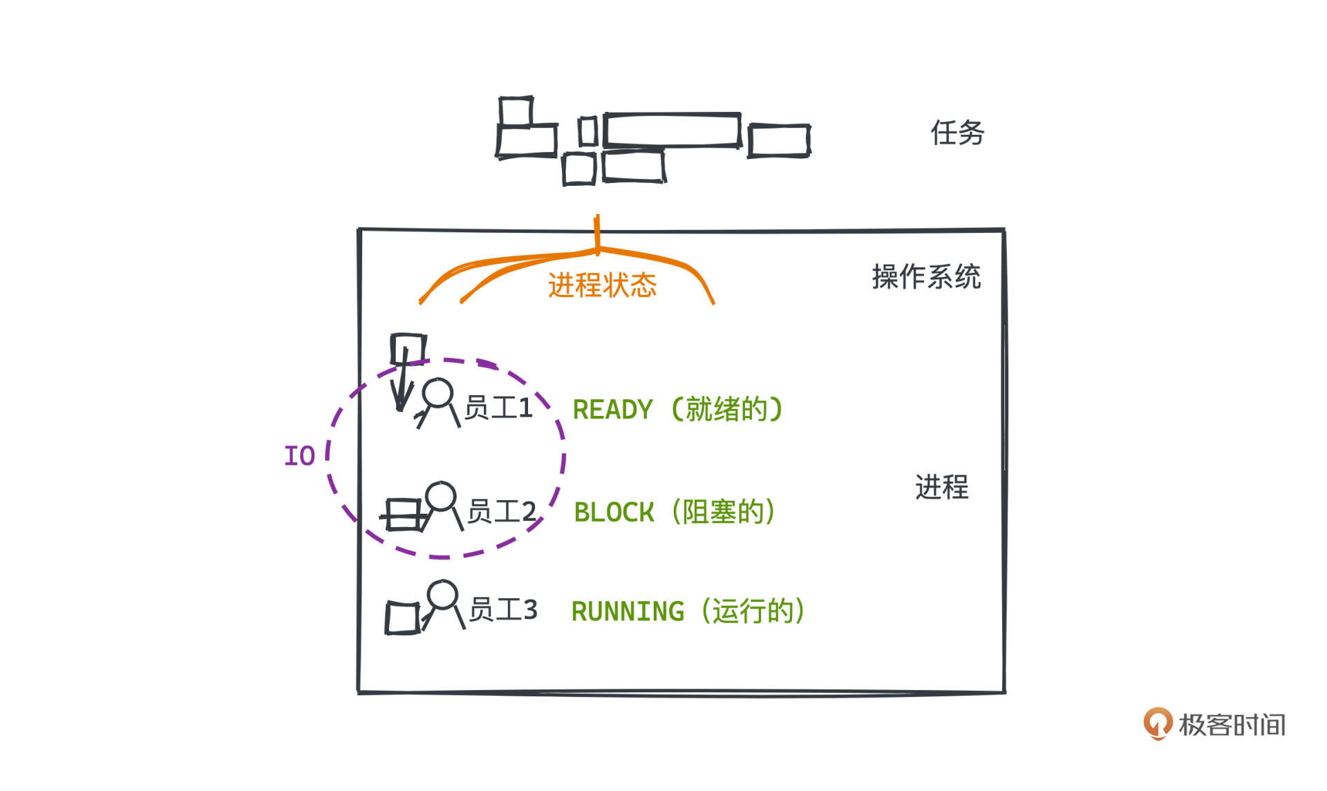 怎么实现调度呢?我们首先要介绍进程状态这个概念。其实就相当于每个员工当前的工作状态,我们只有知道各员工是空闲还是正在工作,才能科学分配需求,以高效完成更多任务。