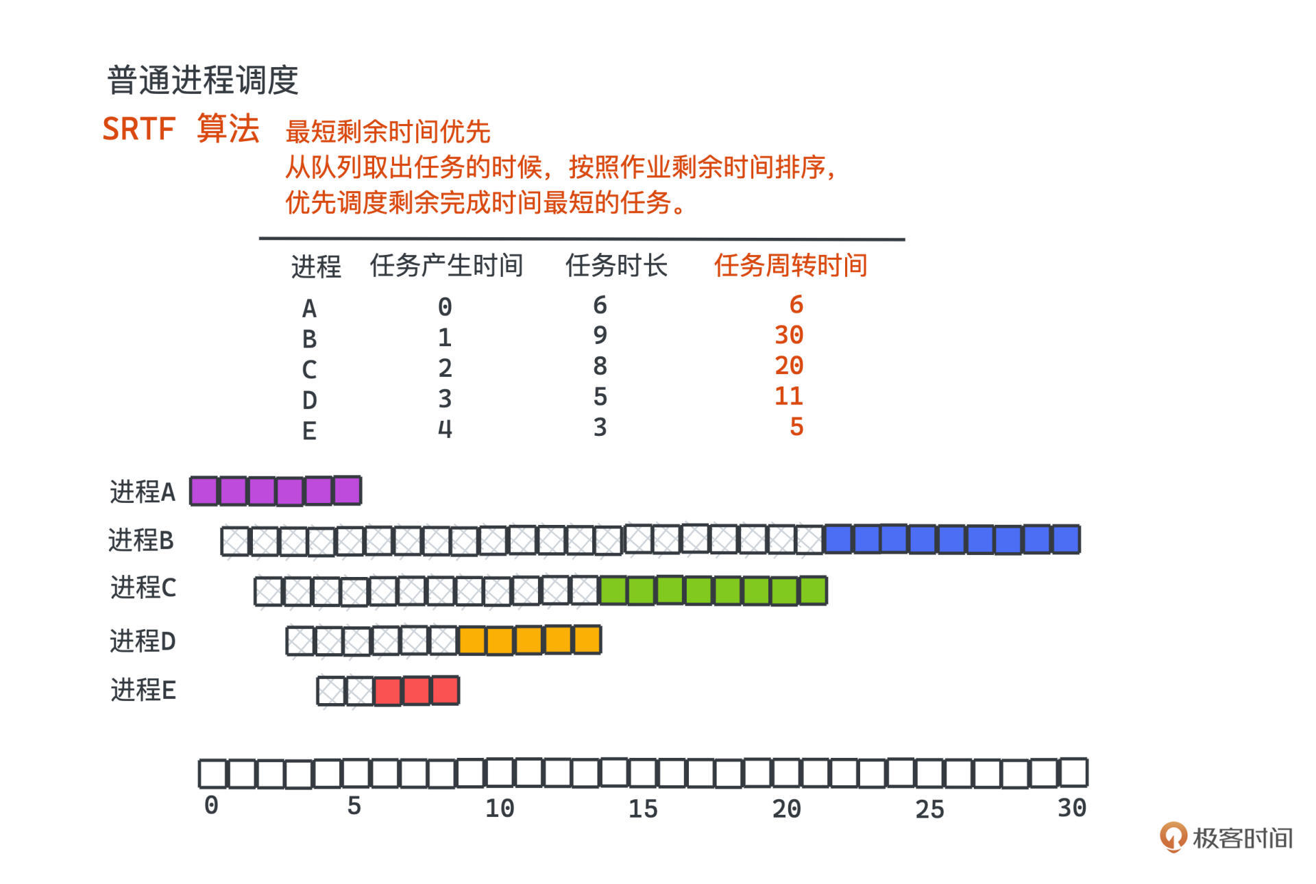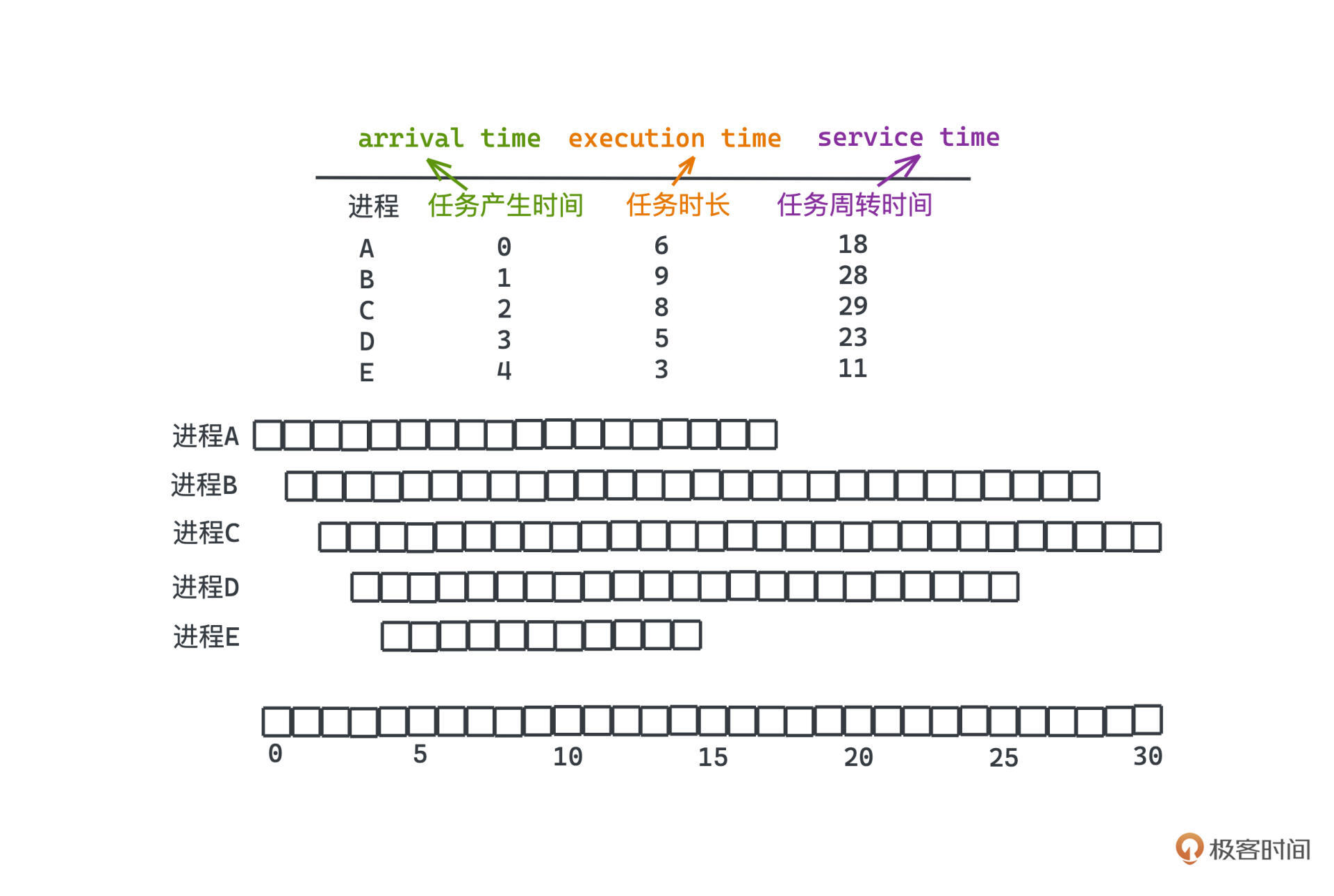 看 Round-Robin 的例子,一共有ABCDE5个进程,arrival time代表进程产生的时间,service time代表进程总共需要执行的时间,单位就是时间片的长度。