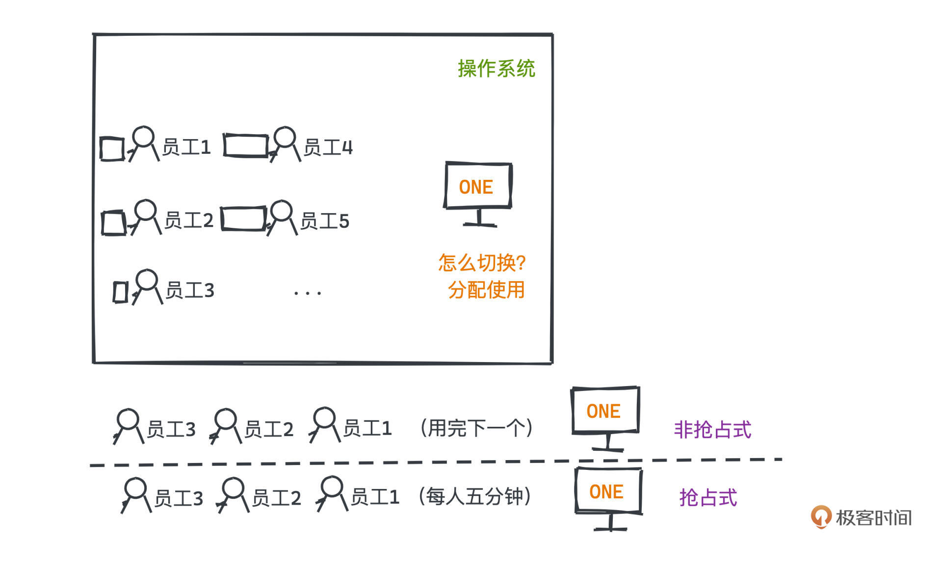 我们还是用公司-员工的例子来简单解释一下这两大类调度策略。
