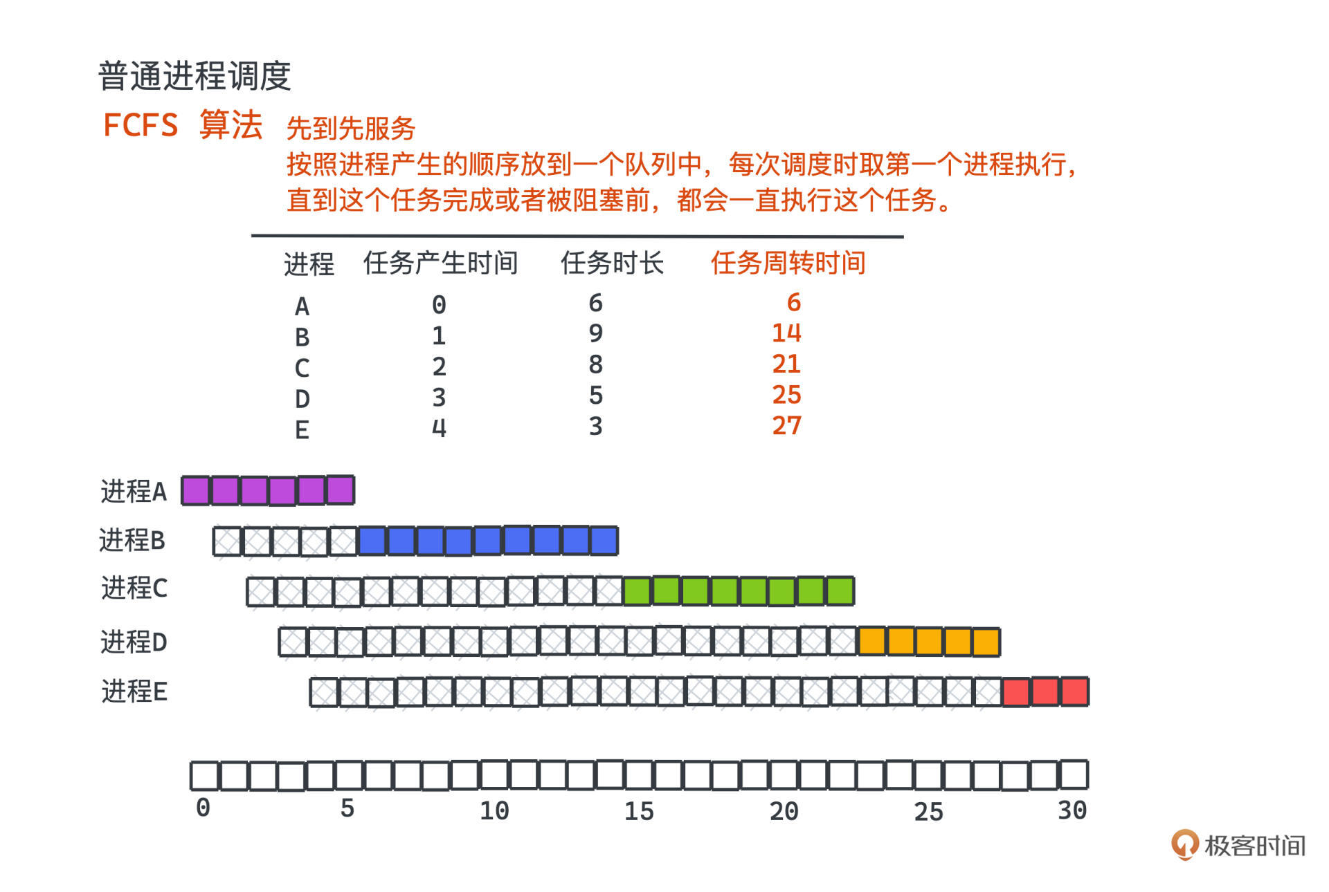 FCFS(First Come First Serve)是最简单也最直接的,其实它和我们学过的队列很像。
