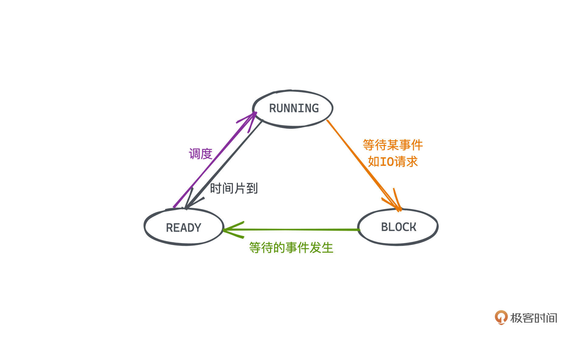 进程状态,本质上就是为了用有限的计算机资源合理且高效地完成更多的任务。我们就看一种简化的模型来学习,把操作系统进程的状态分为3类:READY (就绪的) 、 RUNNING(运行的)、BLOCK(阻塞的)。