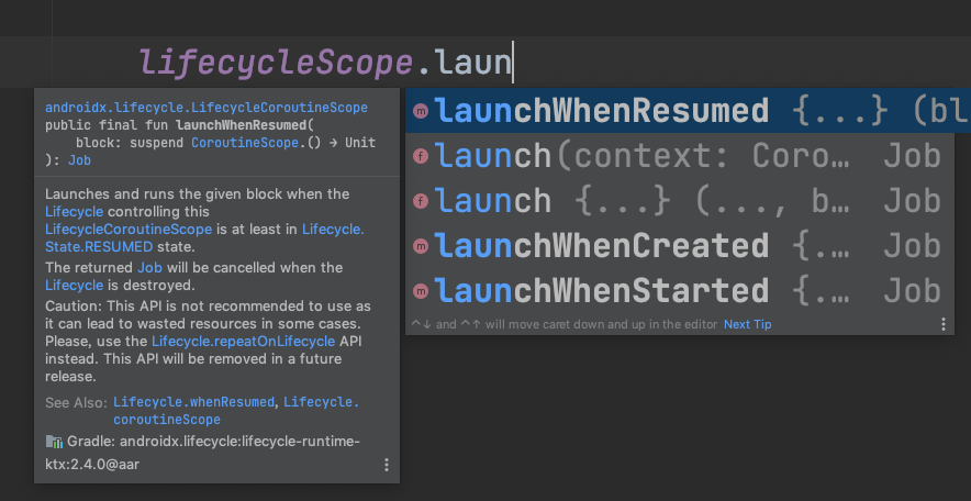 这一点,Android官方早就帮我们考虑到了。Lifecycle还可以跟我们前面提到的KTX结合到一起,进一步为Kotlin协程提供支持。