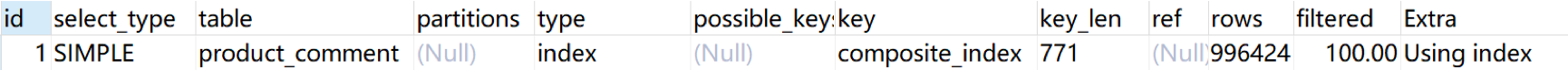 1 | EXPLAIN SELECT comment_id, comment_text, user_id FROM product_comment |