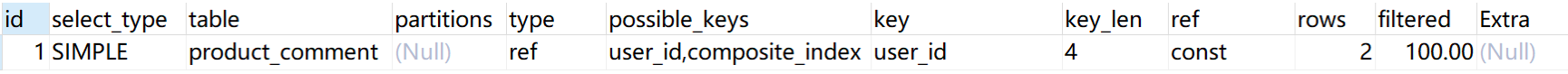 eq_ref类型是使用主键或唯一索引时产生的访问方式,通常使用在多表联查中。假设我们对product_comment表和user表进行联查,关联条件是两张表的user_id相等,使用EXPLAIN进行执行计划查看: