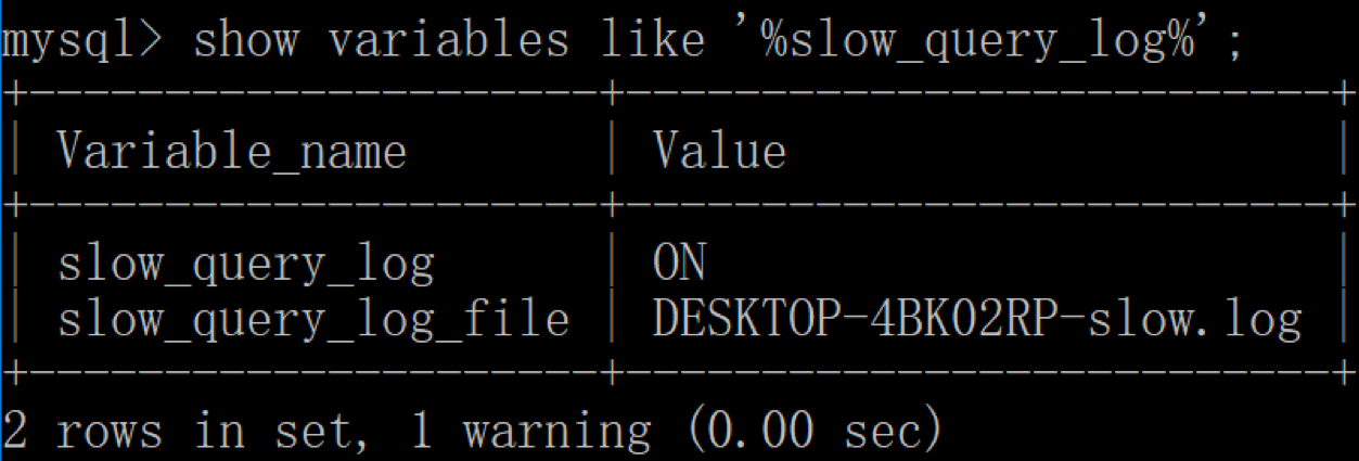 你能看到这时慢查询分析已经开启,同时文件保存在DESKTOP-4BK02RP-slow文件中。