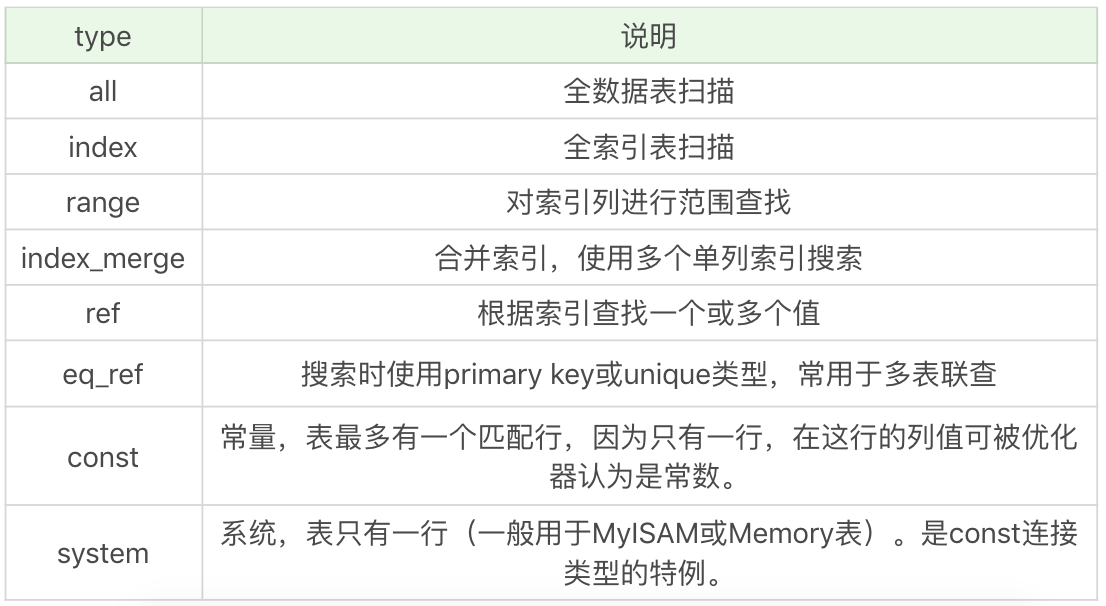 数据表的访问类型所对应的type列是我们比较关注的信息。type可能有以下几种情况: