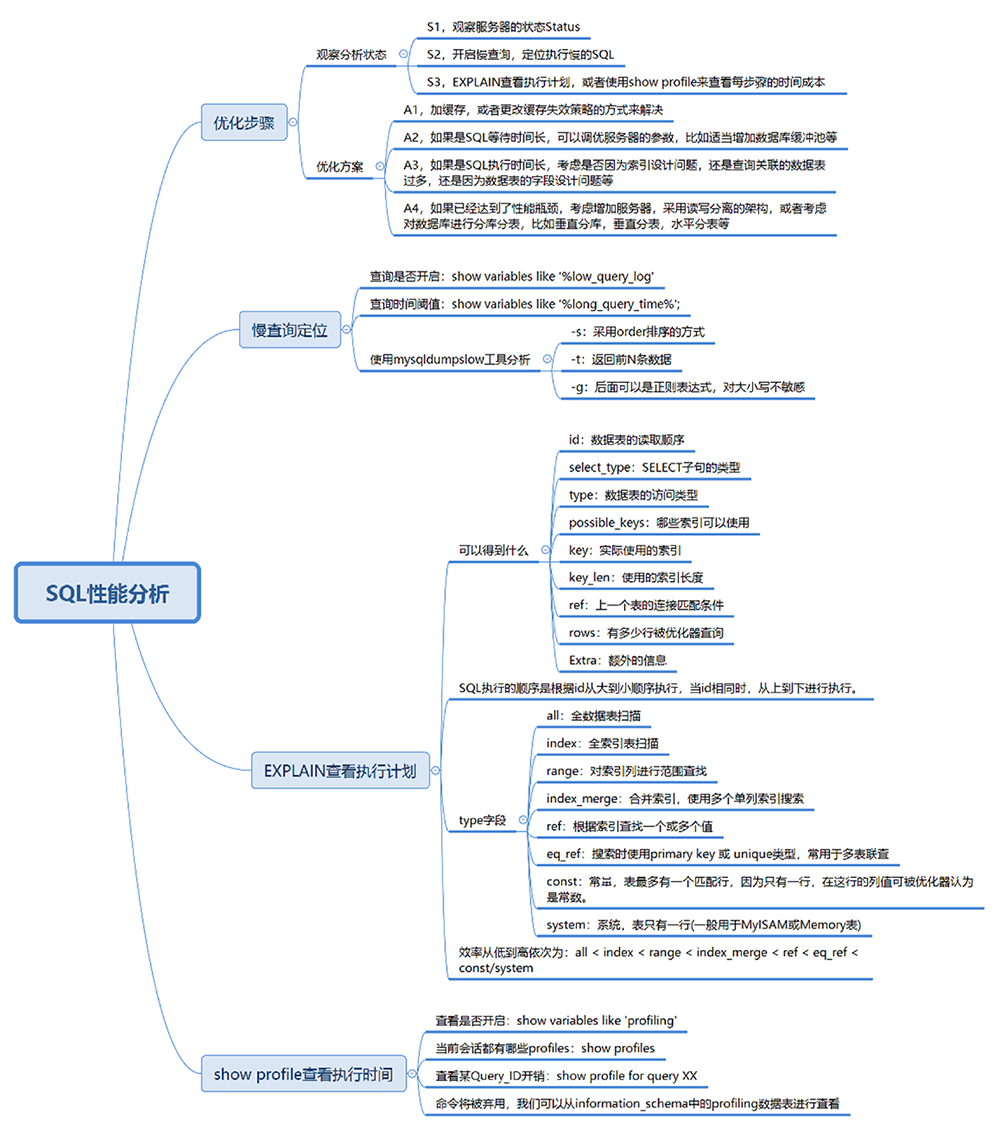 在S3这一步骤中,我们就知道了执行慢的SQL语句,这样就可以针对性地用EXPLAIN查看对应SQL语句的执行计划,或者使用SHOW PROFILE查看SQL中每一个步骤的时间成本。这样我们就可以了解SQL查询慢是因为执行时间长,还是等待时间长。