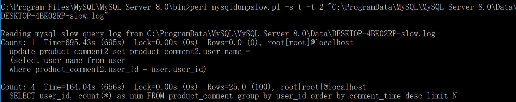 1 | perl mysqldumpslow.pl -s t -t 2 "C:\ProgramData\MySQL\MySQL Server 8.0\Data\DESKTOP-4BK02RP-slow.log" |