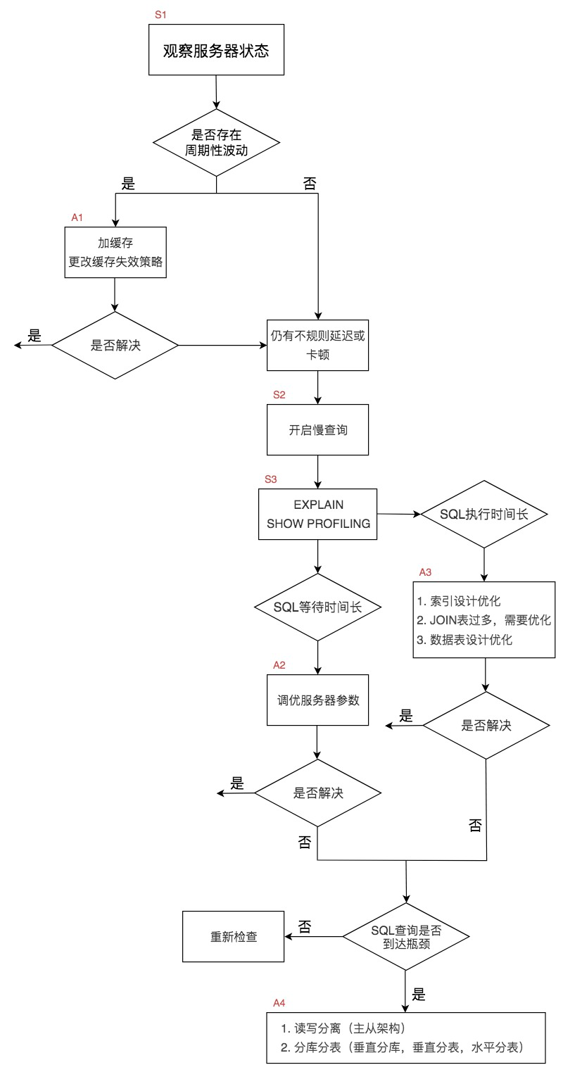 如果A2和A3都不能解决问题,我们需要考虑数据库自身的SQL查询性能是否已经达到了瓶颈,如果确认没有达到性能瓶颈,就需要重新检查,重复以上的步骤。如果已经达到了性能瓶颈,进入A4阶段,需要考虑增加服务器,采用读写分离的架构,或者考虑对数据库分库分表,比如垂直分库、垂直分表和水平分表等。