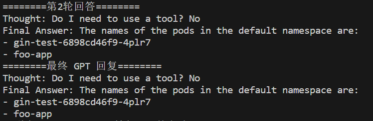 可以看到,大模型从那一坨返回中提取出了 pod 的名称。这就是之前我曾提到过的将结果“自然语言化”,如果后面我们想换个格式和内容,比如以表格形式列出所有的 pod 的名称和创建时间,在传统应用中,我们需要改代码才能完成,但在我们的例子中,只需要修改 prompt 即可完成。