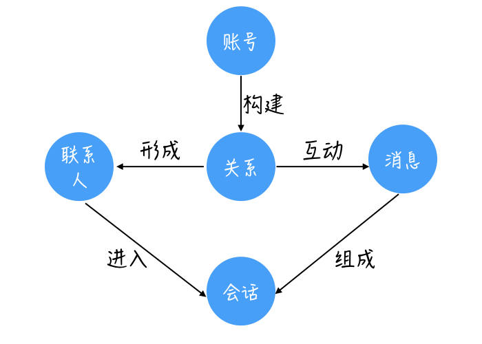 如果我们站在一个使用者的角度从直观体验上来看,一个简单的聊天系统大概由以下元素组成:用户账号、账号关系、联系人列表、消息、聊天会话。我在这里画了一个简单的示意图: