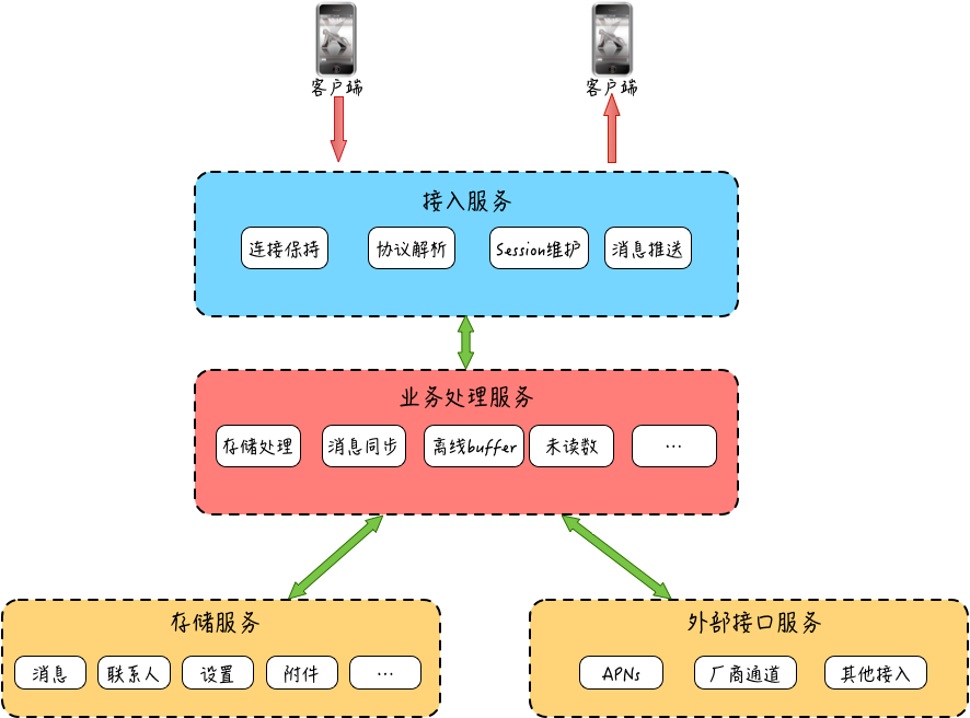 从一个IM系统开发者的角度看,聊天系统大概由这几大部分组成:客户端、接入服务、业务处理服务、存储服务和外部接口服务。
