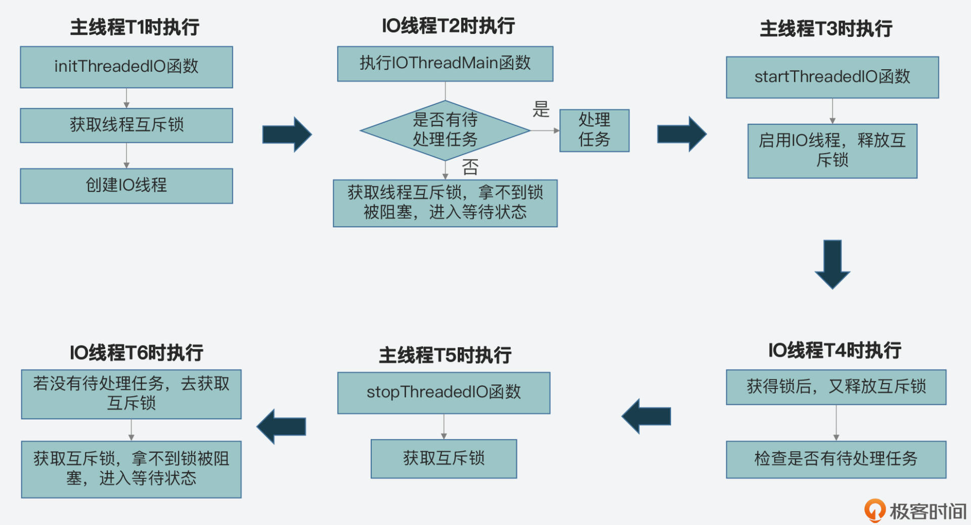 因为这个题目涉及的锁操作在好几个函数间轮流执行,所以,我刚才也是把这个过程的整体流程给你做了解释。下面我也画了一张图,展示了主线程通过加解锁控制IO线程启停的基本过程,你可以再整体回顾下。