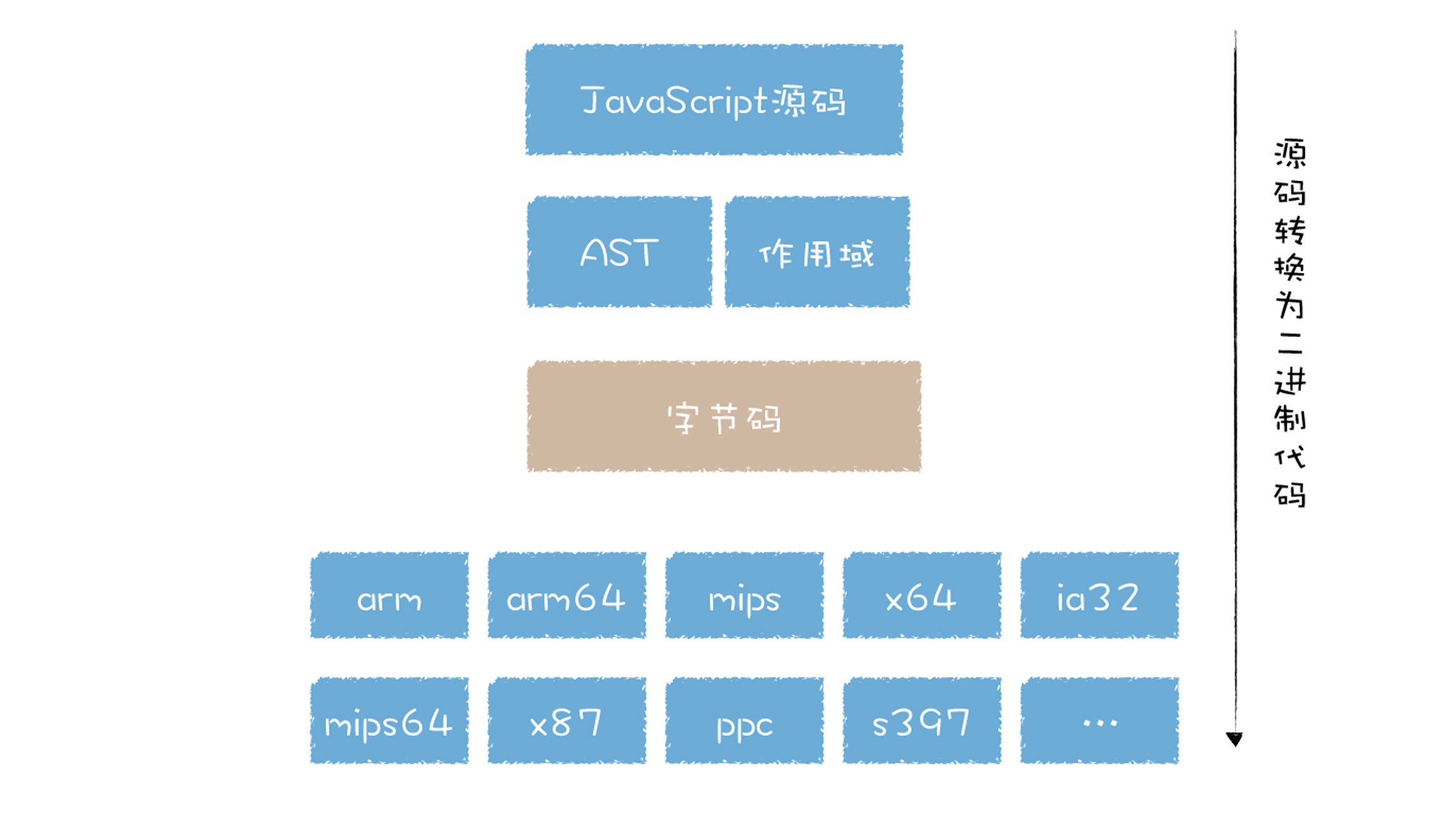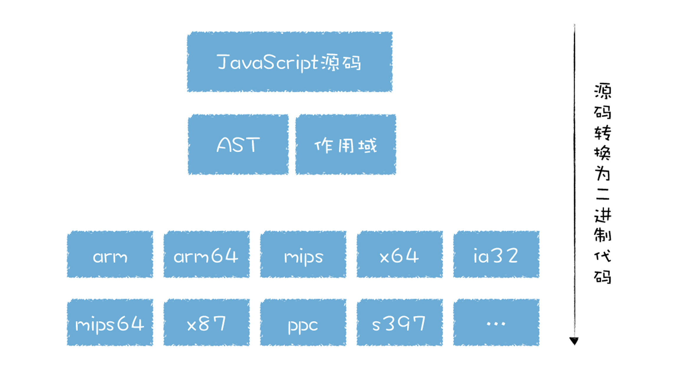 早期的V8代码,无论是基线编译器还是优化编译器,它们都是基于AST抽象语法树来将代码转换为机器码的,我们知道,不同架构的机器码是不一样的,而市面上存在不同架构的处理器又是非常之多,你可以参看下图: