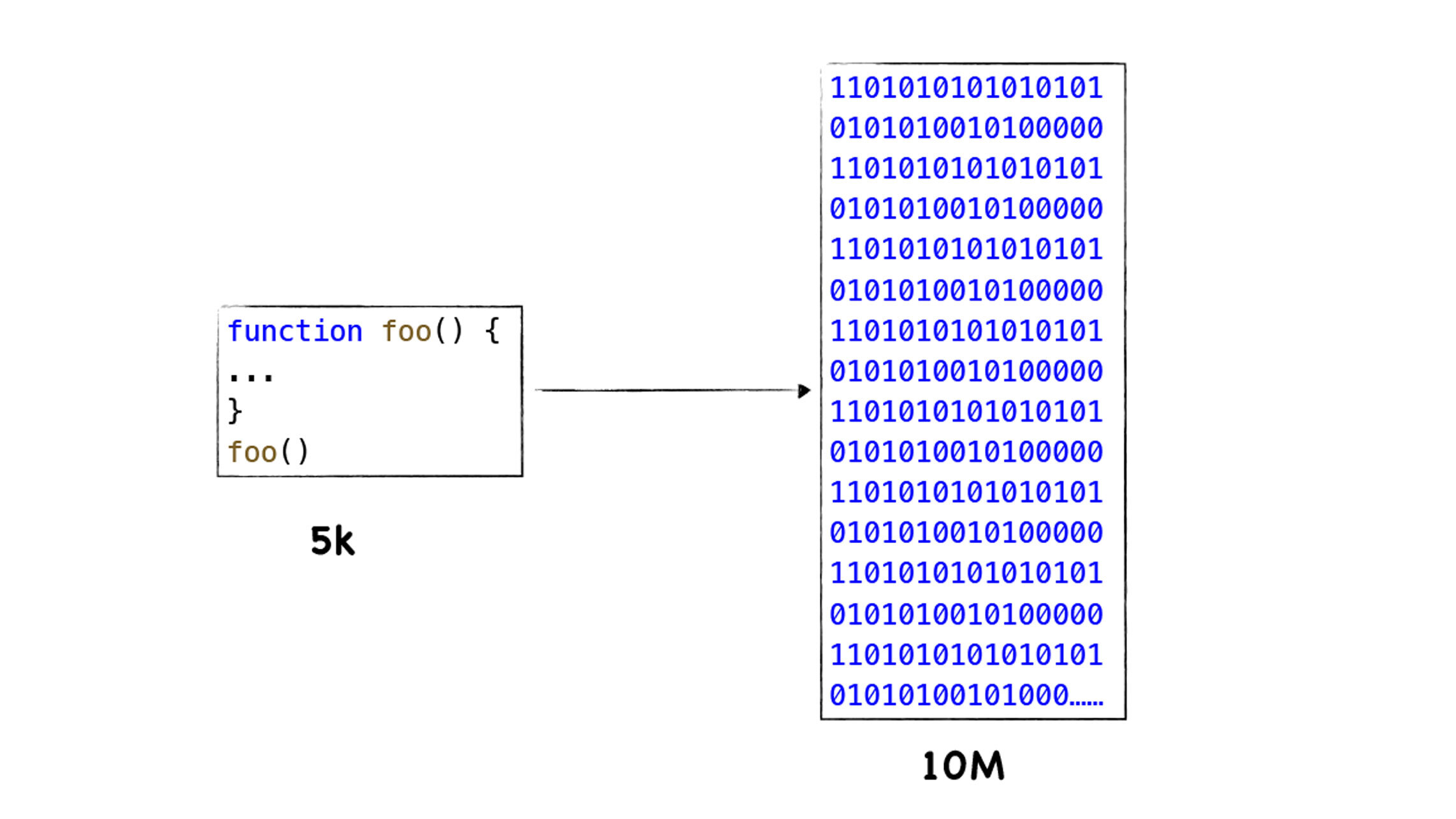 很明显,采用缓存是一种典型的以空间换时间的策略,以牺牲存储空间来换取执行速度,我们知道Chrome的多进程架构已经非常吃内存了,而Chrome中每个页面进程都运行了一份V8实例,V8在执行JavaScript代码的过程中,会将JavaScript代码转换为未经优化的二进制代码,你可以对照下图中的JavaScript代码和二进制代码的:
