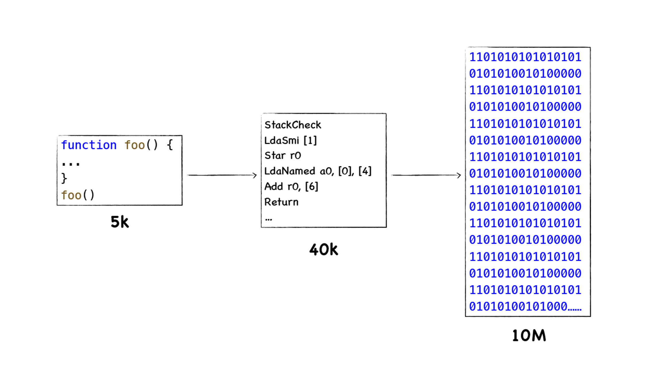 不过随着移动设备的普及,V8团队逐渐发现将JavaScript源码直接编译成二进制代码存在两个致命的问题: