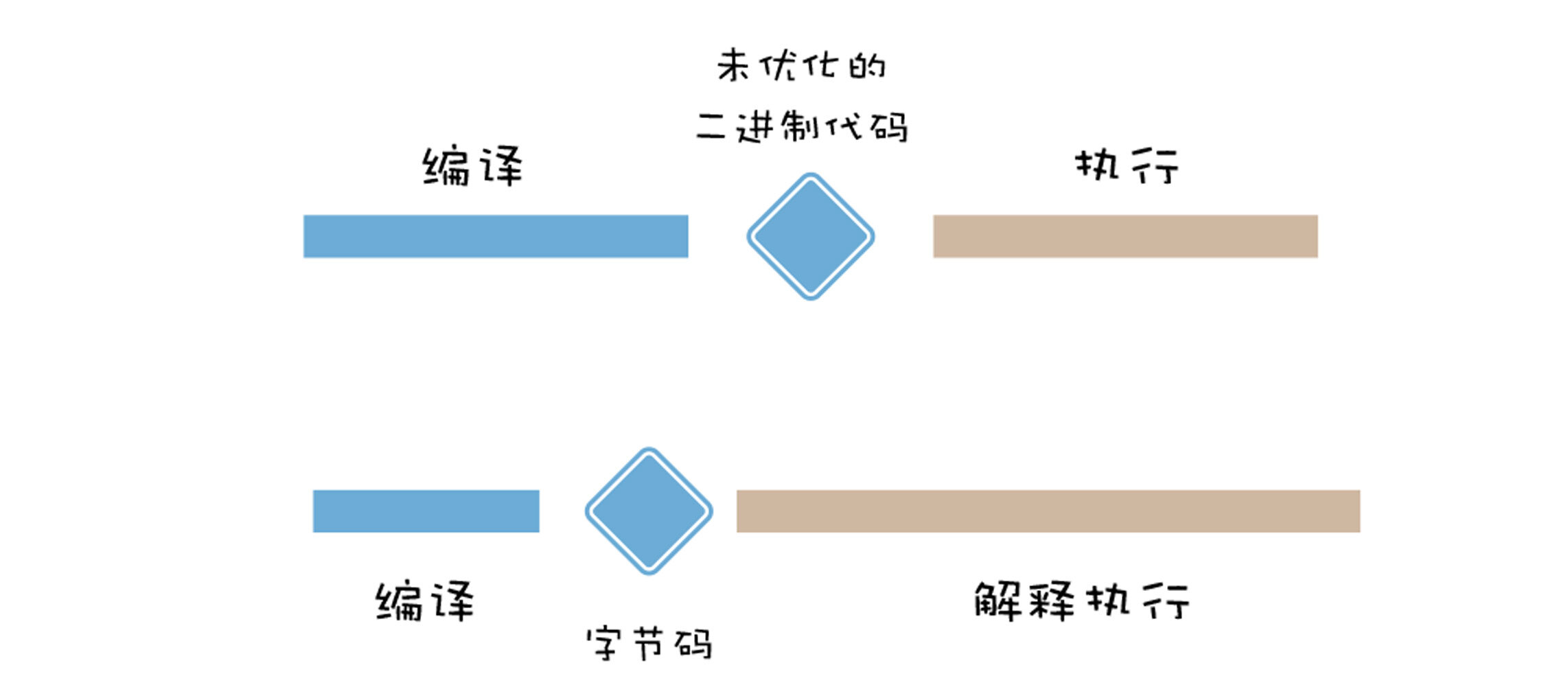 引入了字节码,就可以统一将字节码转换为不同平台的二进制代码,你可以对比下执行流程: