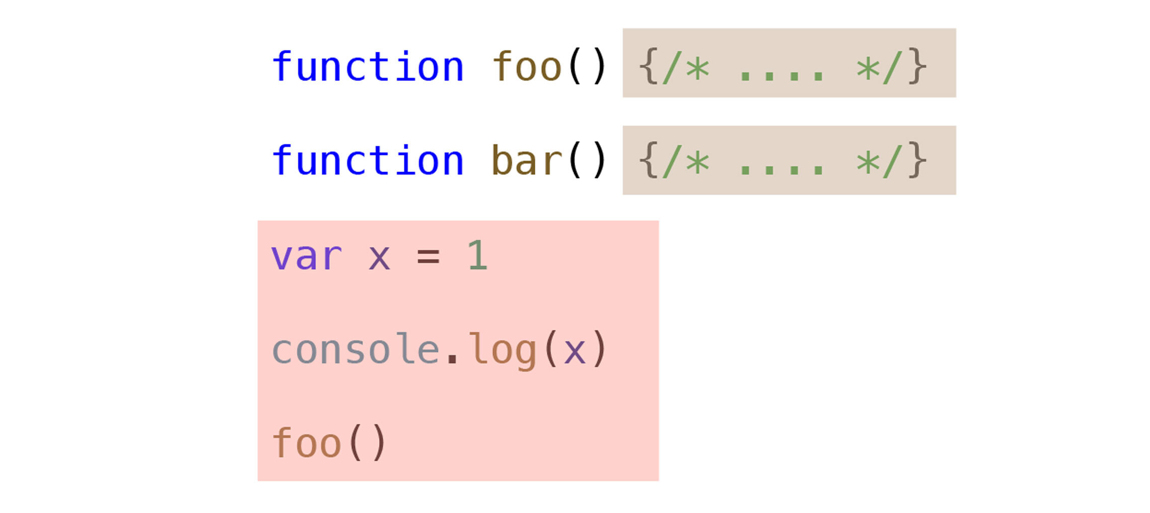 根据惰性编译的原则,当V8首次执行上面这段代码的过程中,开始只是编译最外层的代码,那些函数内部的代码,如下图中的黄色的部分,会推迟到第一次调用时再编译。