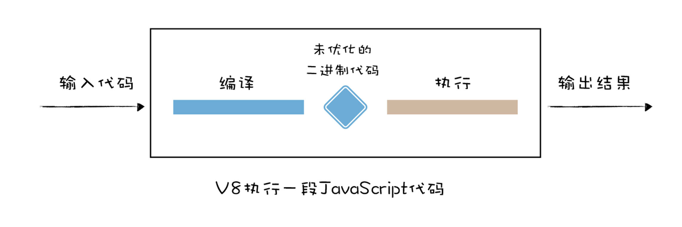于是在早期,V8团队采取了非常激进的策略,直接将JavaScript代码编译成机器代码。其执行流程如下图所示: