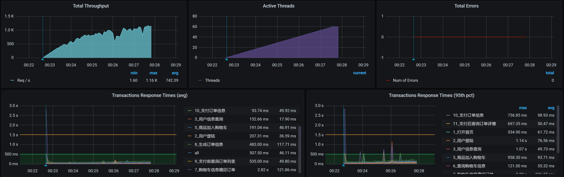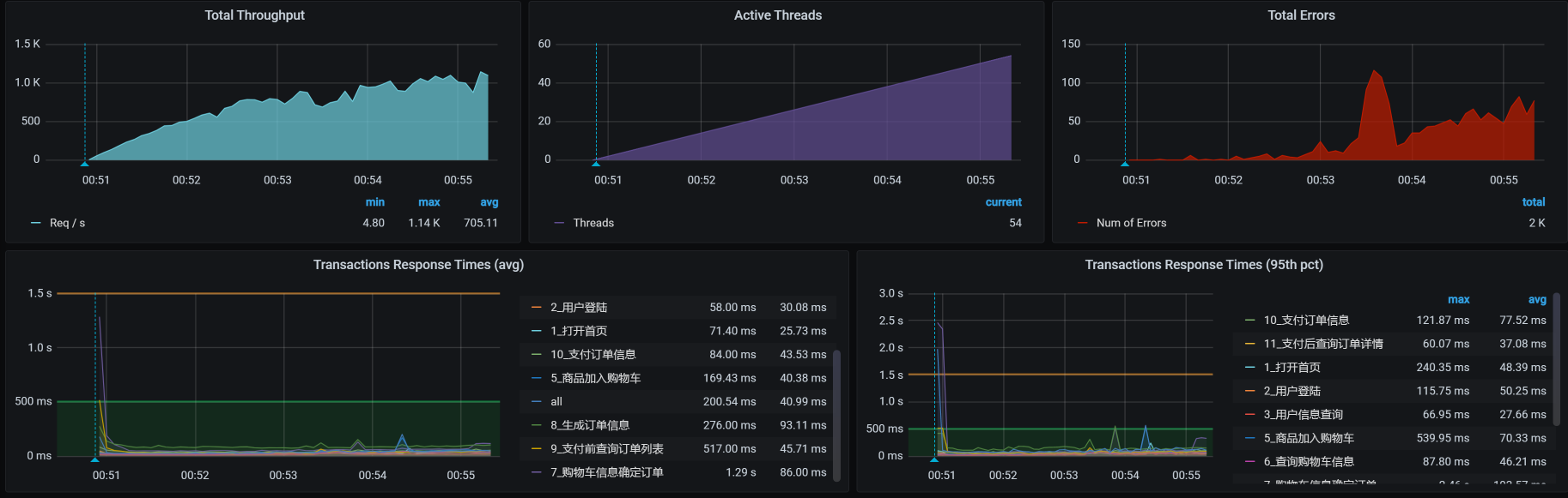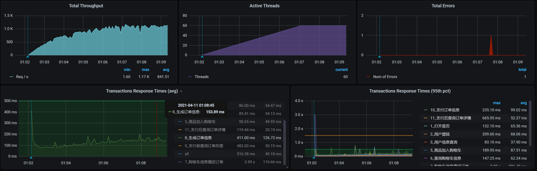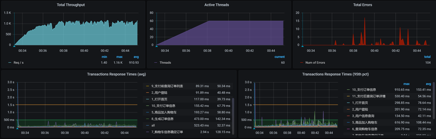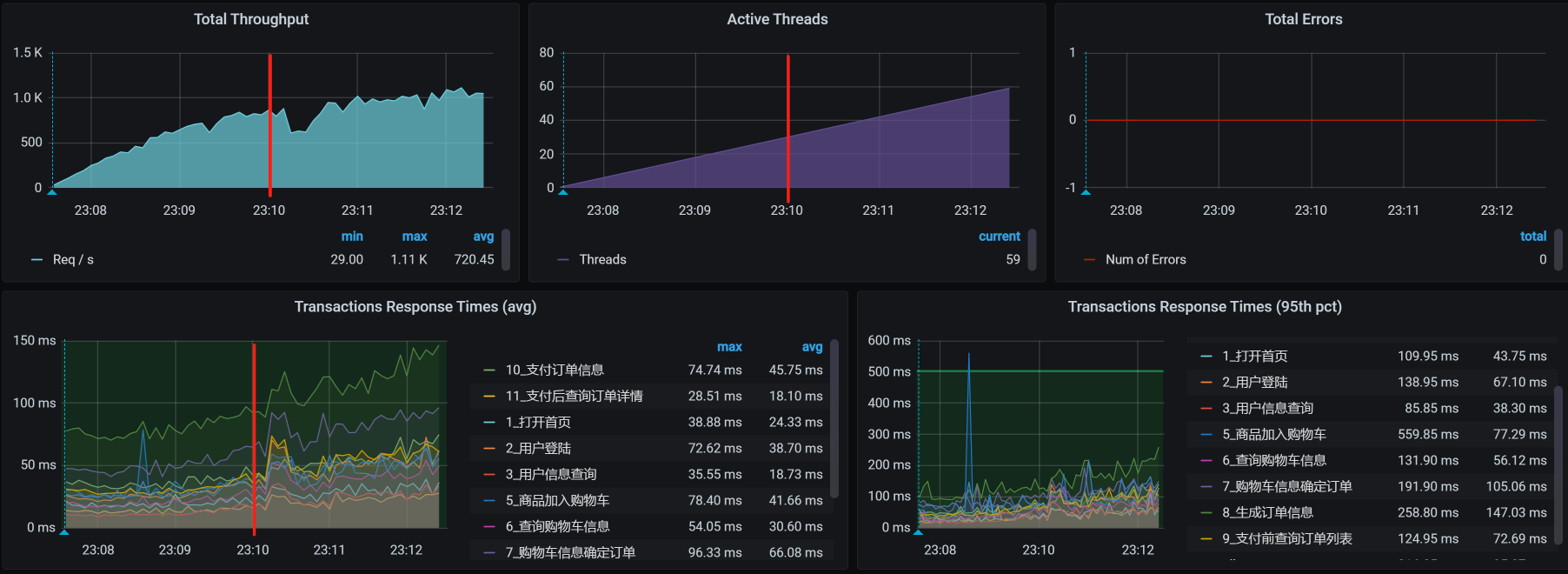 在这个场景中,你可以看到,在30压力线程时,TPS大概能达到800左右。但是,随着压力的增加,TPS也能达到1000,只是响应时间也随之有了明显的递增趋势。