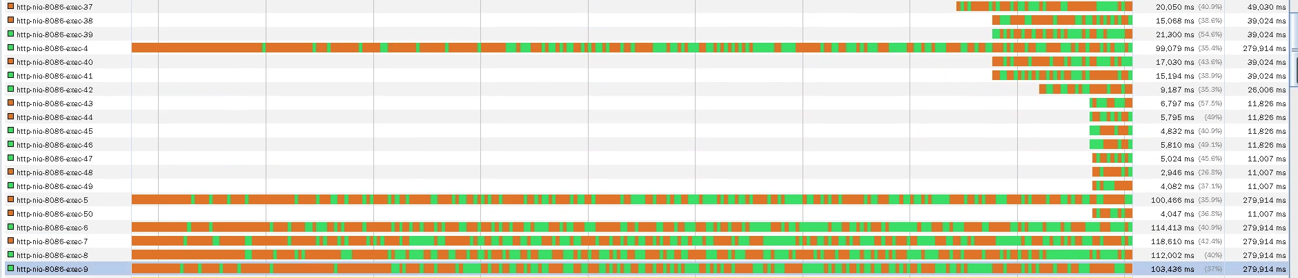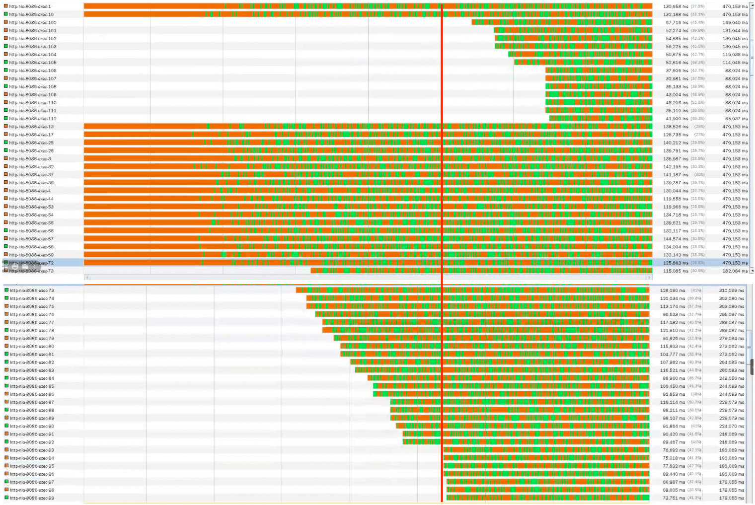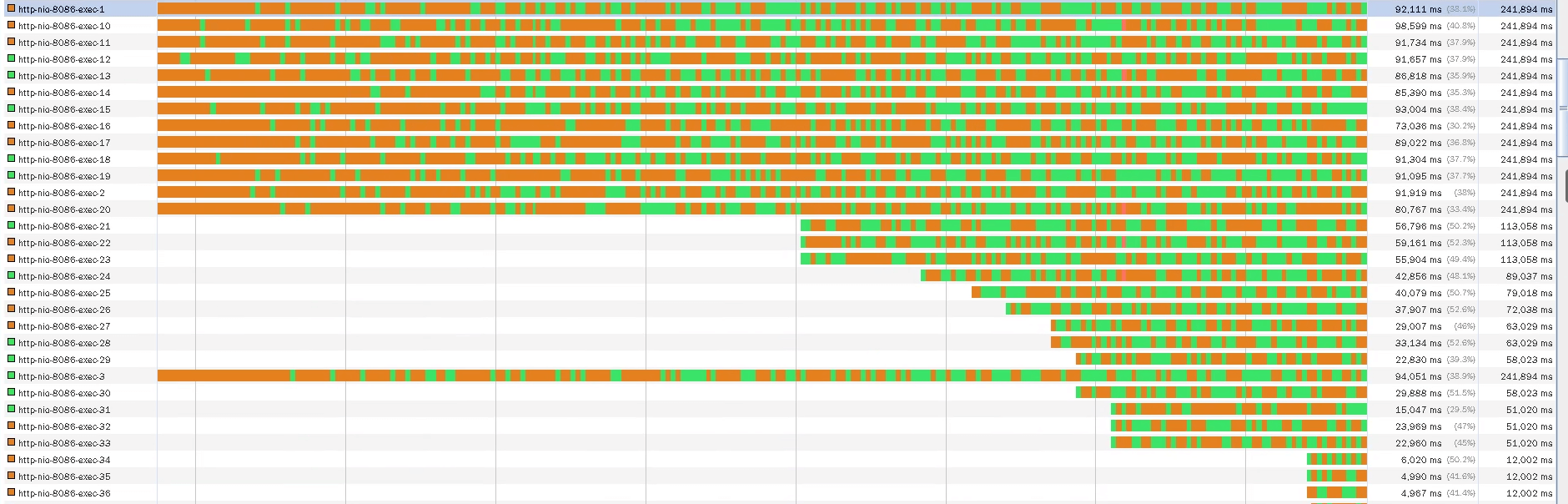 从线程的数量来看,线程数是在自适应增加的。对应压力中的TPS曲线和响应时间增加的地方,我们可以看到大概41个工作线程。随着压力的持续增加,TPS还在增加,但是,响应时间慢慢变长了。从提供服务的角度来说,用户会感觉系统在逐渐变慢。